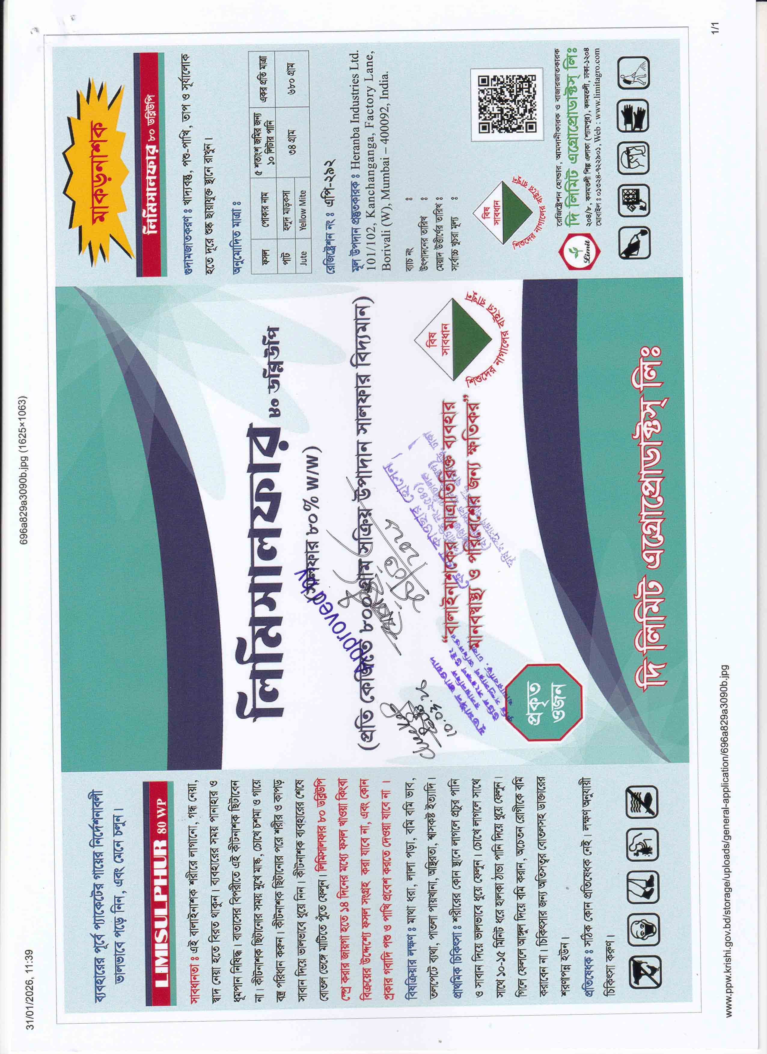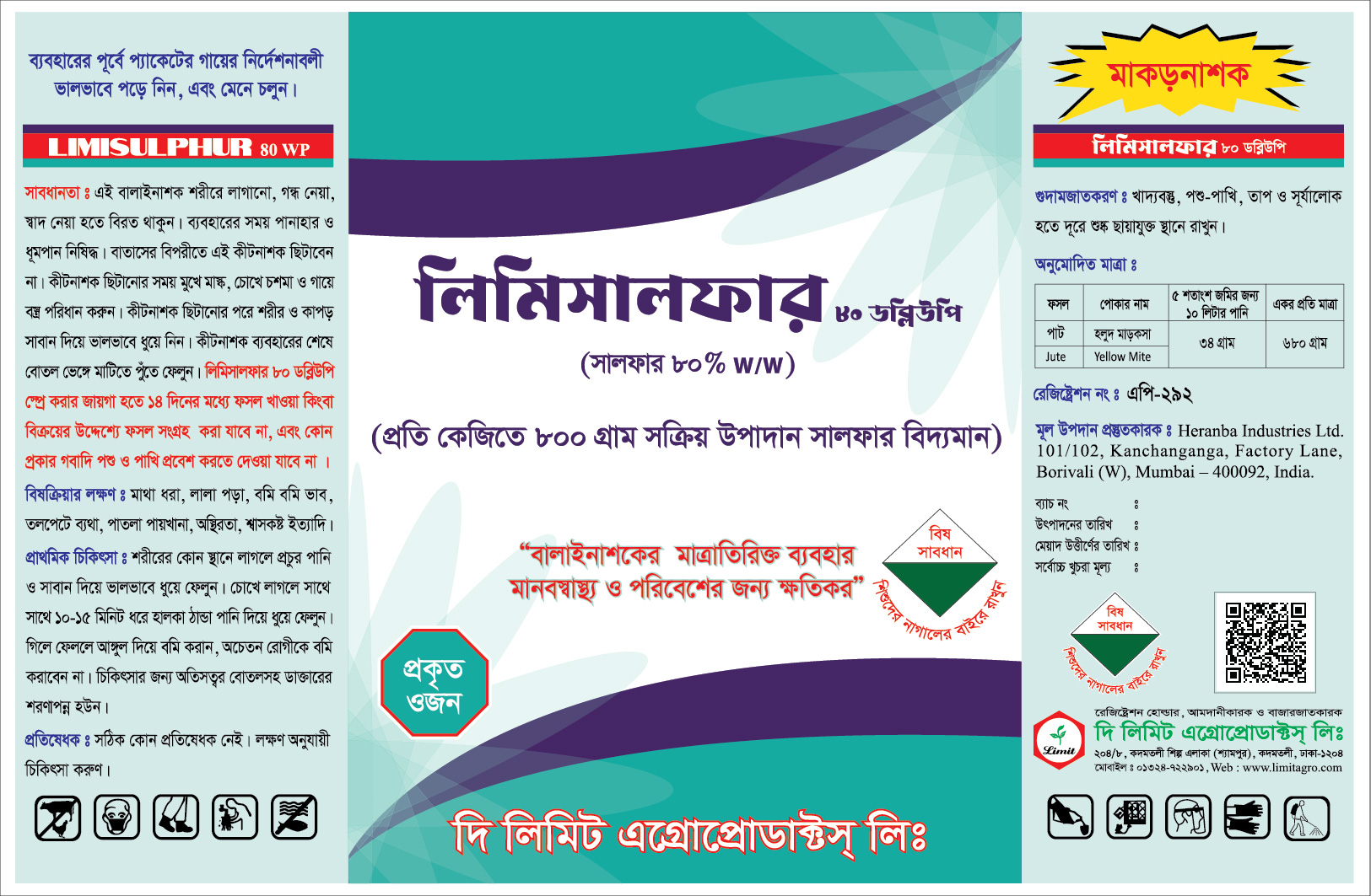 লিমিসালফার ৮০ ডব্লিউপি এর প্রতি কেজিতে ৮০০ গ্রাম সালফার স্বয়ংক্রিয় উপাদান বিদ্যমান। ইহা পাটের চাষের জমির হলুদ মাকড়সা (Yellow Mite) দমনে অধিক কার্যকরী।