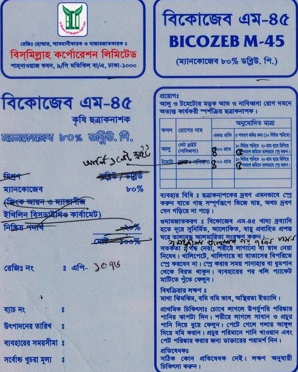 গুদামজাতকরণঃ বিকোজেব এম-৪৫ খাদ্য দ্রব্যাদি হতে দূরে সুনির্মিত, আলোকিত, বায়ু প্রবাহিত প্রশস্ত ঘরে তালাবদ্ধ আলমারিতে সংরক্ষণ করুন। সতর্কতাঃ বালাইনাশক প্রয়োগ করার পর ৭ দিন ফসল খাবেন না। গন্ধ নেয়া, শরীরে লাগানো বা স্বাদ নেয়া নিষেধ। খালিপেটে, খালি গায়ে বা বাতাসের বিপরিতে স্প্রে করবেন না। স্প্রে করার সময় পানাহার বা ধুমপান থেকে বিরত থাকুন। ব্যবহারের পর খালি প্যাকেট মাটিতে পুঁতে ফেলুন। বিষক্রিয়ার লক্ষণঃ মাথা ঝিমঝিম, বমি বমি ভাব, অস্থিরতা ইত্যাদি। প্রাথমিক চিকিৎসাঃ চোখে লাগলে উপর্যুপরি পরিষ্কার পানির ঝাপটা দিন। শরীরে লাগলে সাবান ও প্রচুর পানি দিয়ে ধুয়ে ফেলুন। পেটে গেলে গলায় আঙ্গুল দিয়ে বমি করান। প্রচুর পরিমানে পানি খাওয়ান এবং পেট পরিস্কার করার জন্য ডাক্তারের পরামর্শ নিন। প্রতিষেধকঃ সঠিক কোন প্রতিষেধক নেই। লক্ষণ অনুযায়ী চিকিৎসা করুন।