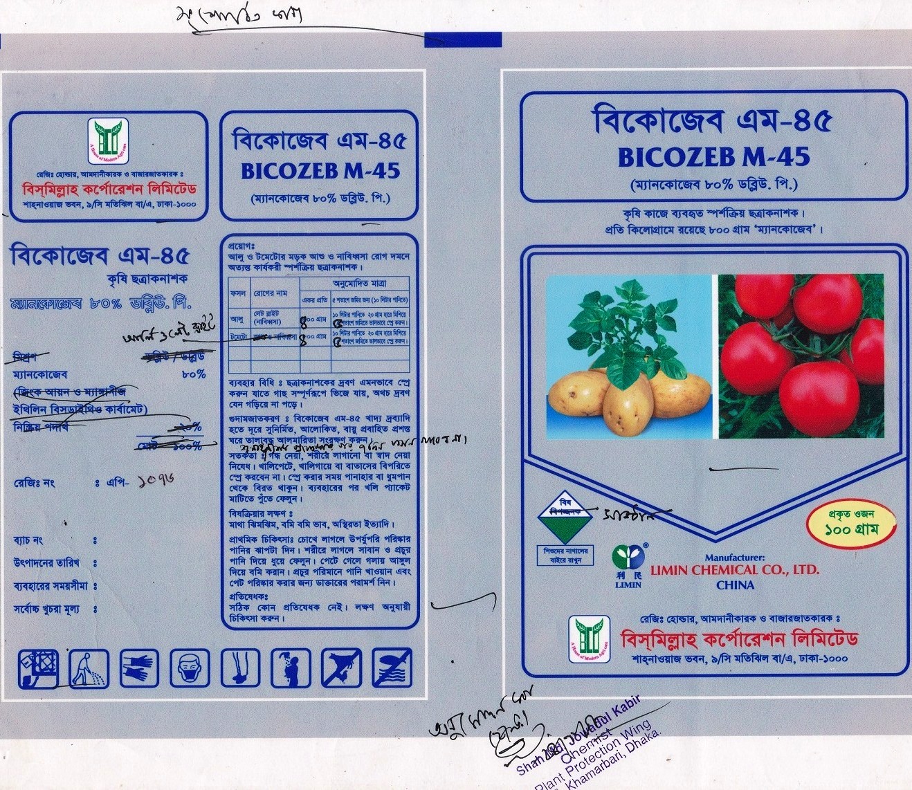 ফসল – আলু, রোগের নাম - লেট ব্লাইট (নাবিধ্বসা), একর প্রতি অনুমোদিত মাত্রা – ৪০০ গ্রাম, ১০ লিটার পানিতে ২০ গ্রাম হারে মিশিয়ে ৫ শতাংশ জমিতে ভালভাবে স্প্রে করুন। ফসল – টমেটো, রোগের নাম - আর্লি ও লেট ব্লাইট, একর প্রতি অনুমোদিত মাত্রা – ৪০০ গ্রাম, ১০ লিটার পানিতে ২০ গ্রাম হারে মিশিয়ে ৫ শতাংশ জমিতে ভালভাবে স্প্রে করুন। ব্যবহার বিধিঃ ছত্রাকনাশকের দ্রবণ এমনভাবে স্প্রে করুন যাতে গাছ সম্পূর্ণরূপে ভিজে যায়, অথচ দ্রবণ যেন গড়িয়ে না পড়ে।