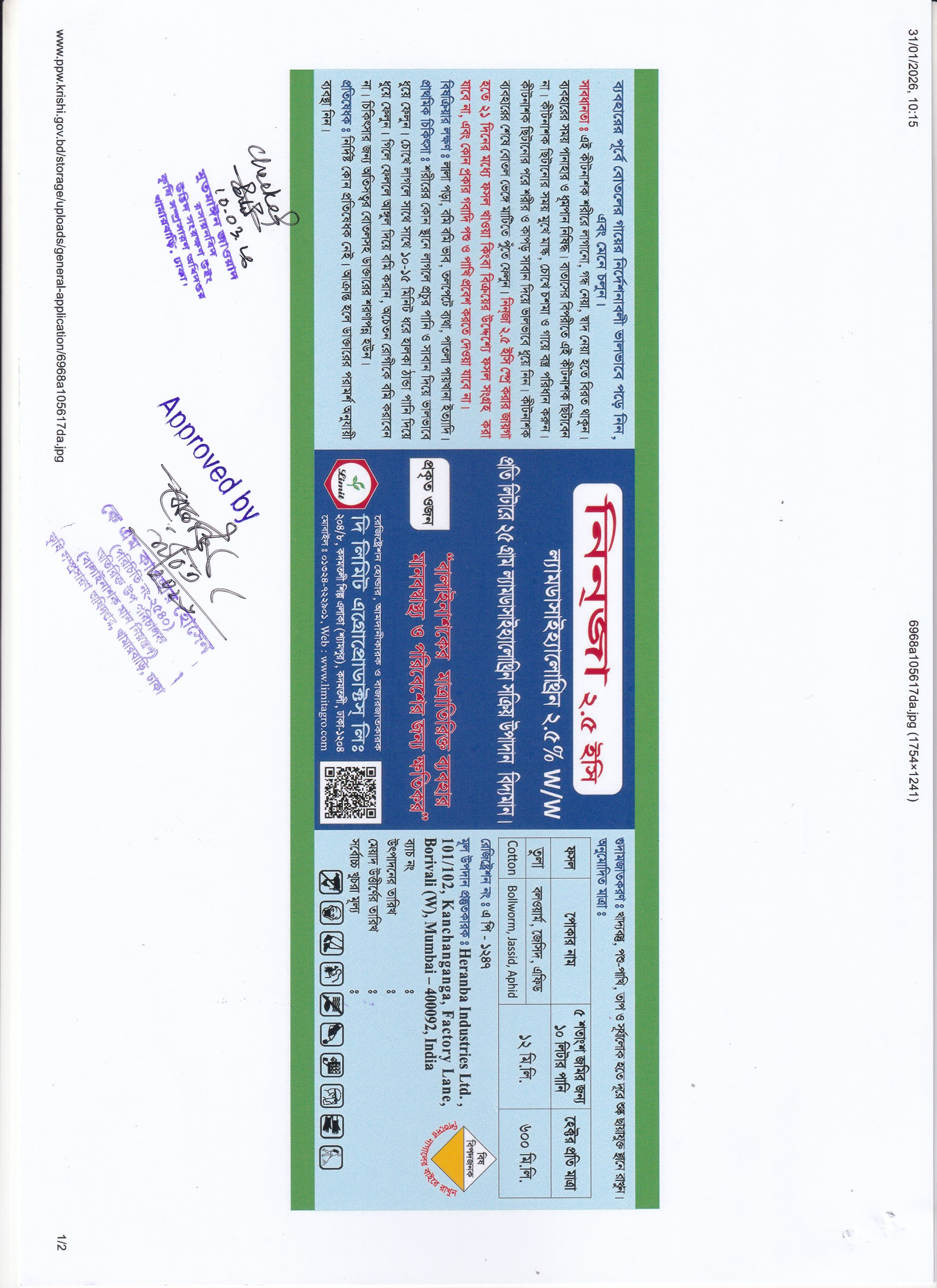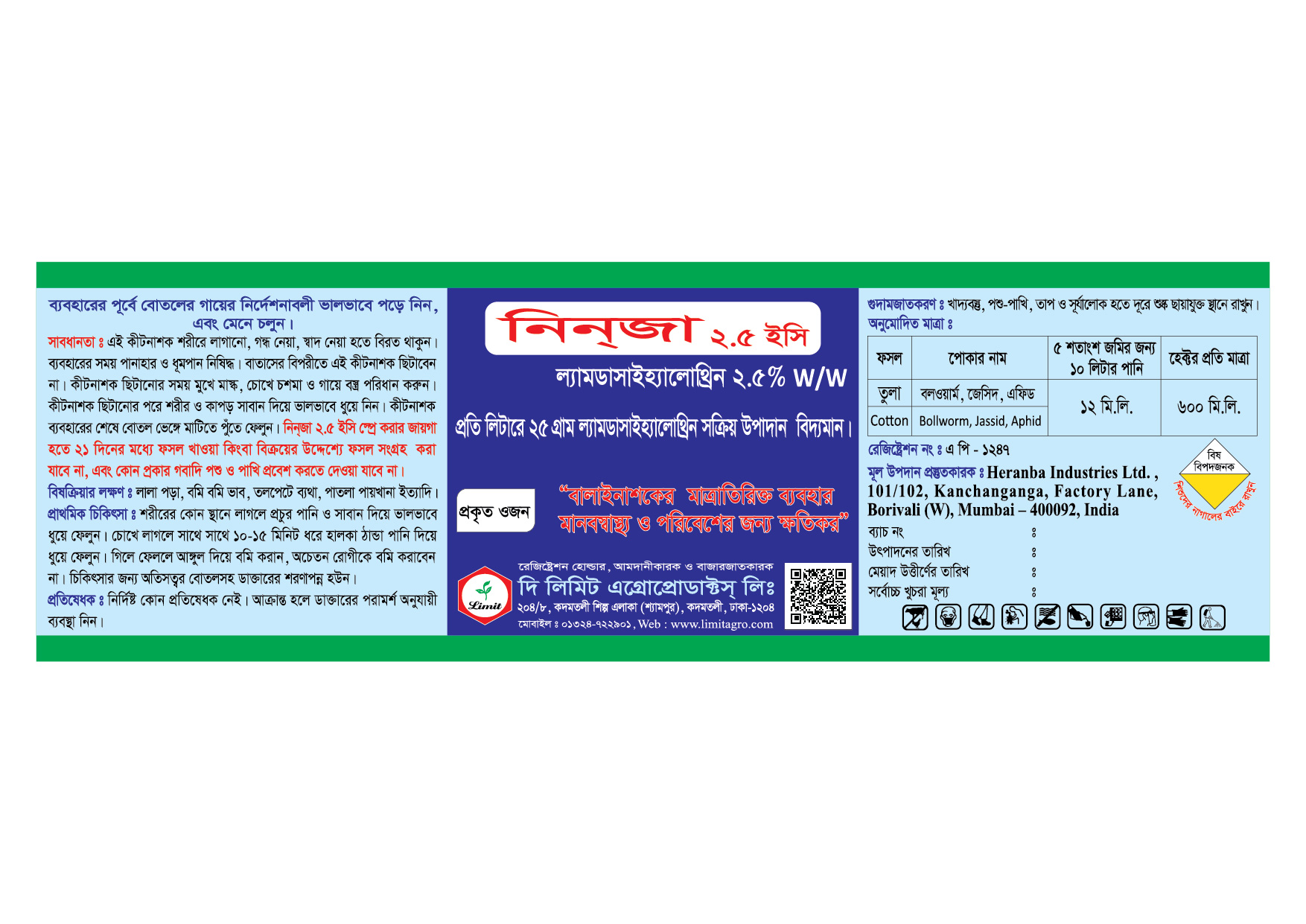 নিনজা ২.৫ ইসি এর প্রতি লিটারে ২৫ গ্রাম ল্যামডাসাইহ্যালোথ্রিন স্বয়ংক্রিয় উপাদান বিদ্যমান। ইহা তুলার জেসিদ, এফিড এবং বলওয়ার্ম নামক পোকা দমনে অধিক কার্যকরী।