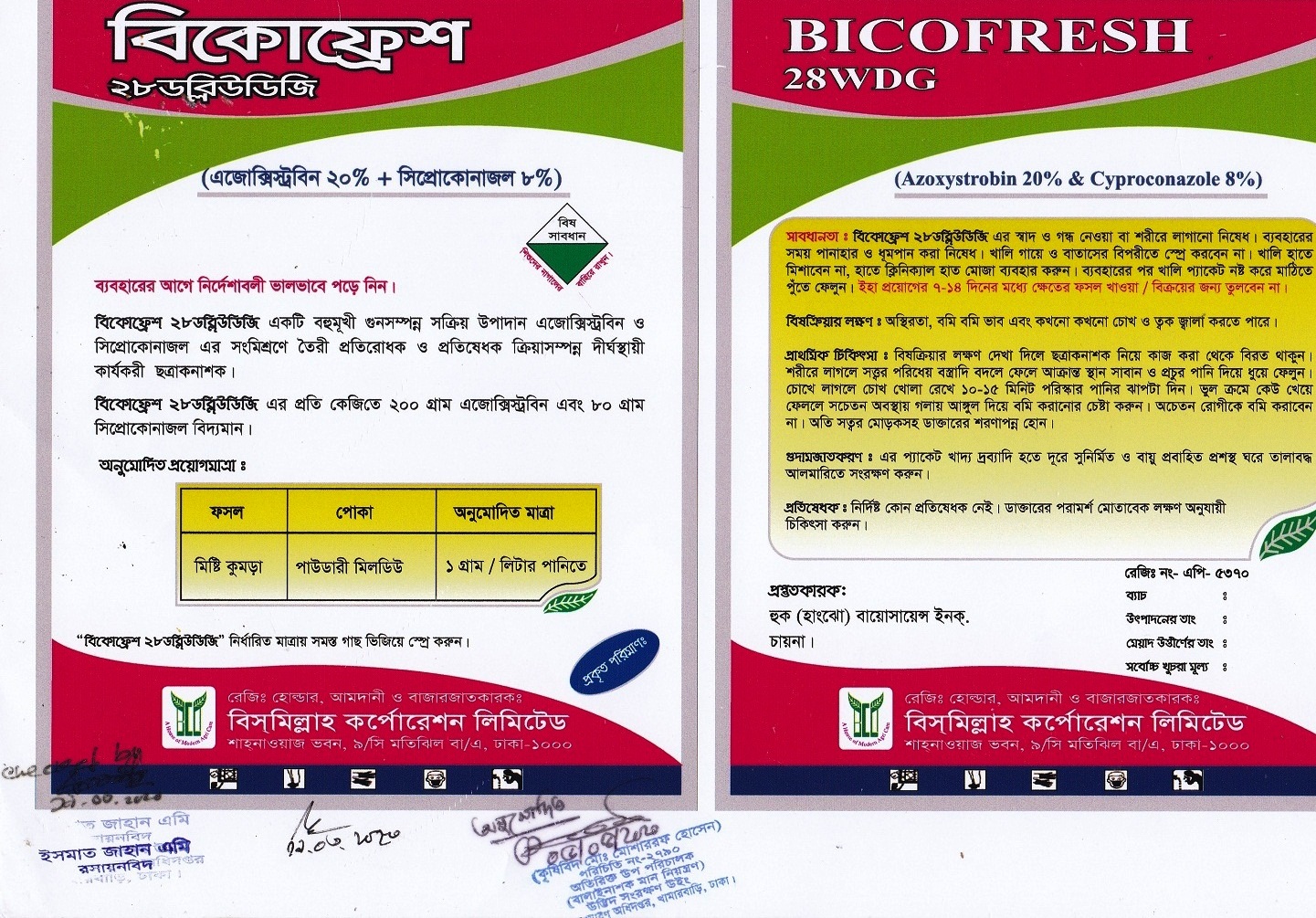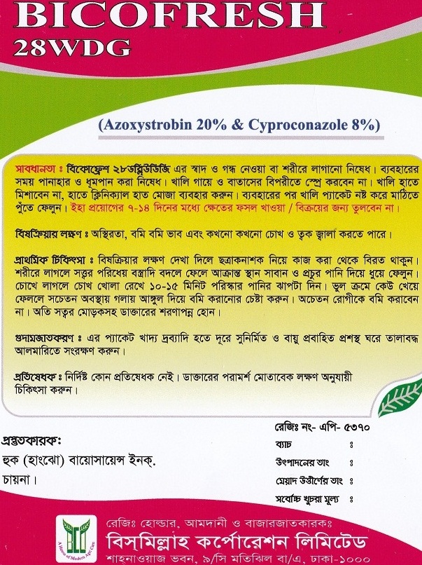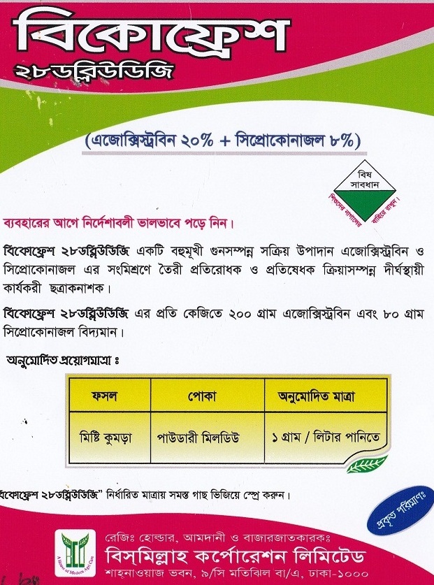 বিকোফ্রেশ ২৮ ডব্লিউ ডি জি একটি বহুমুখী গুনসম্পন্ন সক্রিয় উপাদান এজোক্সিস্ট্রবিন ও সিপ্রোকোনাজল এর সংমিশ্রণে তৈরী প্রতিরোধক ও প্রতিষেধক ক্রিয়াসম্পন্ন দীর্ঘস্থায়ী কার্যকরী ছত্রাকনাশক।