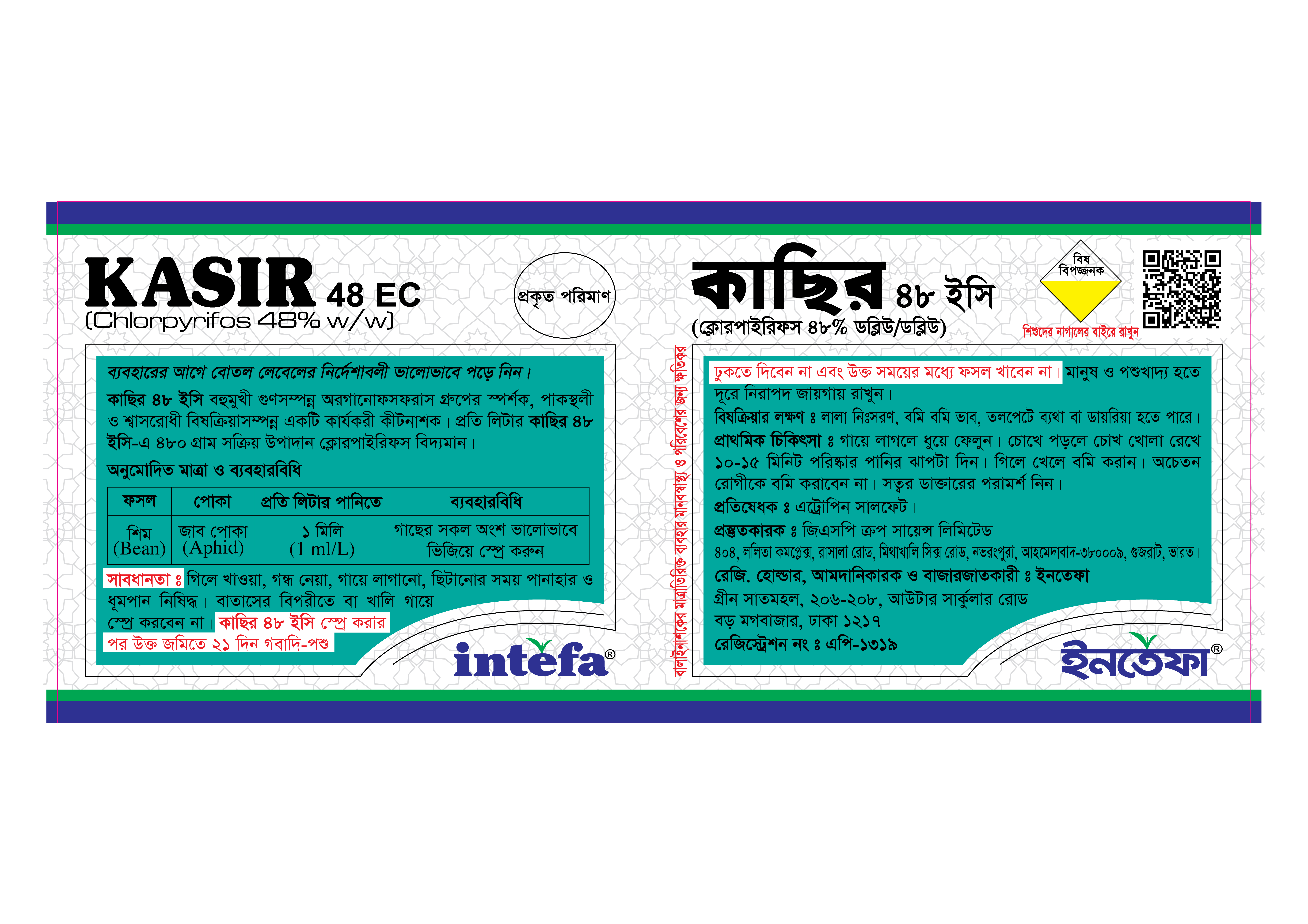 কাছির ৪৮ ইসি বহুমুখী গুণসম্পন্ন অরগানোফসফরাস গ্রুপের স্পর্শক, পাকস্থলী ও শ্বাসরোধী বিষক্রিয়াসম্পন্ন একটি কার্যকরী কীটনাশক। প্রতি লিটার কাছির ৪৮ ইসি-এ ৪৮০ গ্রাম সক্রিয় উপাদান ক্লোরপাইরিফস বিদ্যমান।