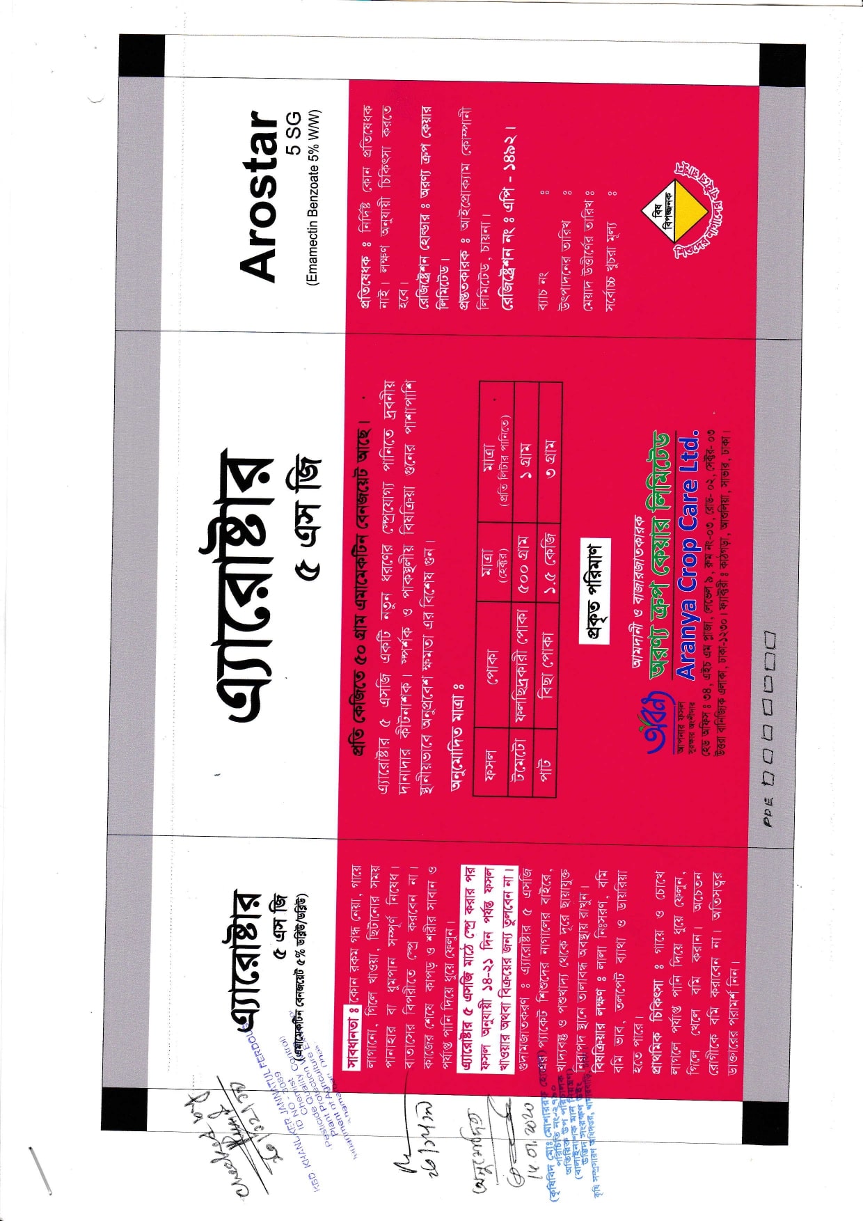 এ্যারোষ্টার 5 এস জি প্রয়োগের পর কমপক্ষে 14-21 দিন পর্যন্ত ফসল খাওয়া বা বিক্রয়ের জন্য তুলবেন না।