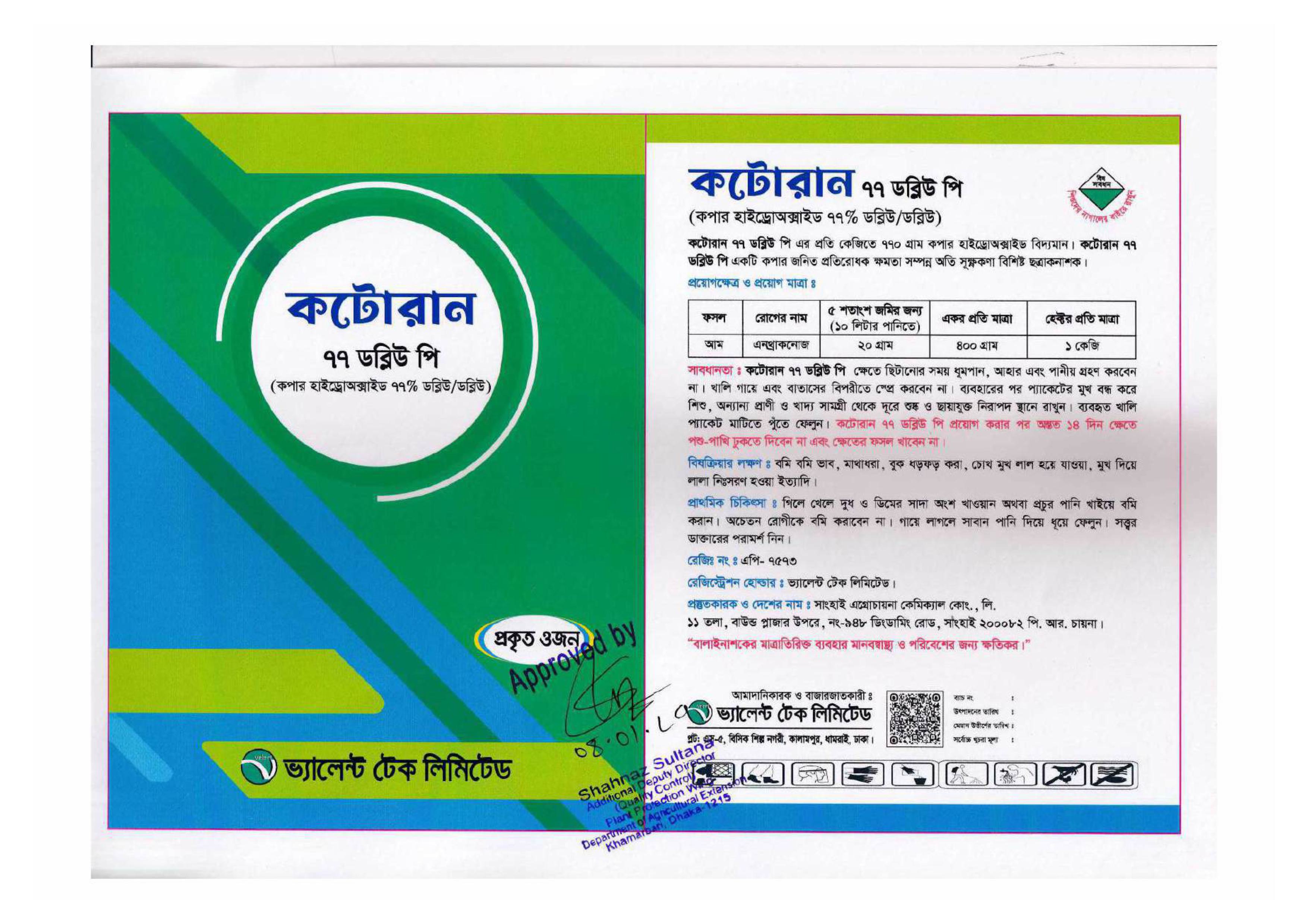 কটোরান ৭৭ ডব্লিউ পি একটি কপার জনিত প্রতিরোধক ক্ষমতা সম্পন্ন অতি সূক্ষ্ণকণা বিশিষ্ট ছত্রাকনাশক। যা বিভিন্ন ফসলের এনথ্রাকনোজ রোগ দমনে অত্যন্ত কার্যকারি