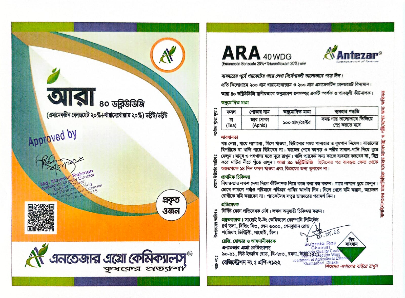 আরা ৪০ ডব্লিউডিজি একটি দ্বৈত কার্যকরী, স্পর্শক ও পাকস্থলী ক্রিয়াশীল কীটনাশক, যেখানে এমামেকটিন বেনজোয়েট শুঁয়োপোকা দমন করে এবং থায়ামেথোক্সাম চোষণকারী পোকার উপর দ্রুত কার্যকর। এটি পোকার স্নায়ুতন্ত্রে আক্রমণ করে → খাওয়া ও চলাচল বন্ধ করে → দ্রুত নকডাউন সৃষ্টি করে → অল্প সময়ের মধ্যেই নিশ্চিতভাবে পোকা দমন করে।