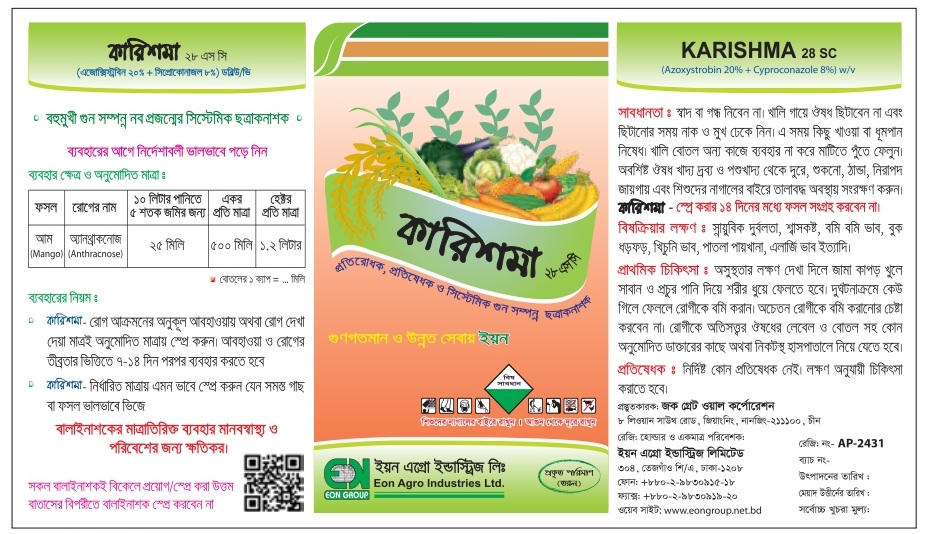 আমের অ্যানথ্রাকনোজ দমনে অত্যন্ত কার্যকর। বহুমুখী গুণ সম্পন্ন নব প্রজন্মের আধুনিক সিস্টেমেক (প্রবাহমান) ছত্রাকনাশক। সিস্টেমিক ছত্রাকনাশক বিধায় রোগ আক্রমনের আগে ও পরে ব্যবহার করা যায়। নতুন পাতা ও কান্ডকে রোগের আক্রমন থেকে সুরক্ষা দেয়। গুনগত মান ও উন্নত সেবার নিশ্চয়তা দেয় কারিশমা।