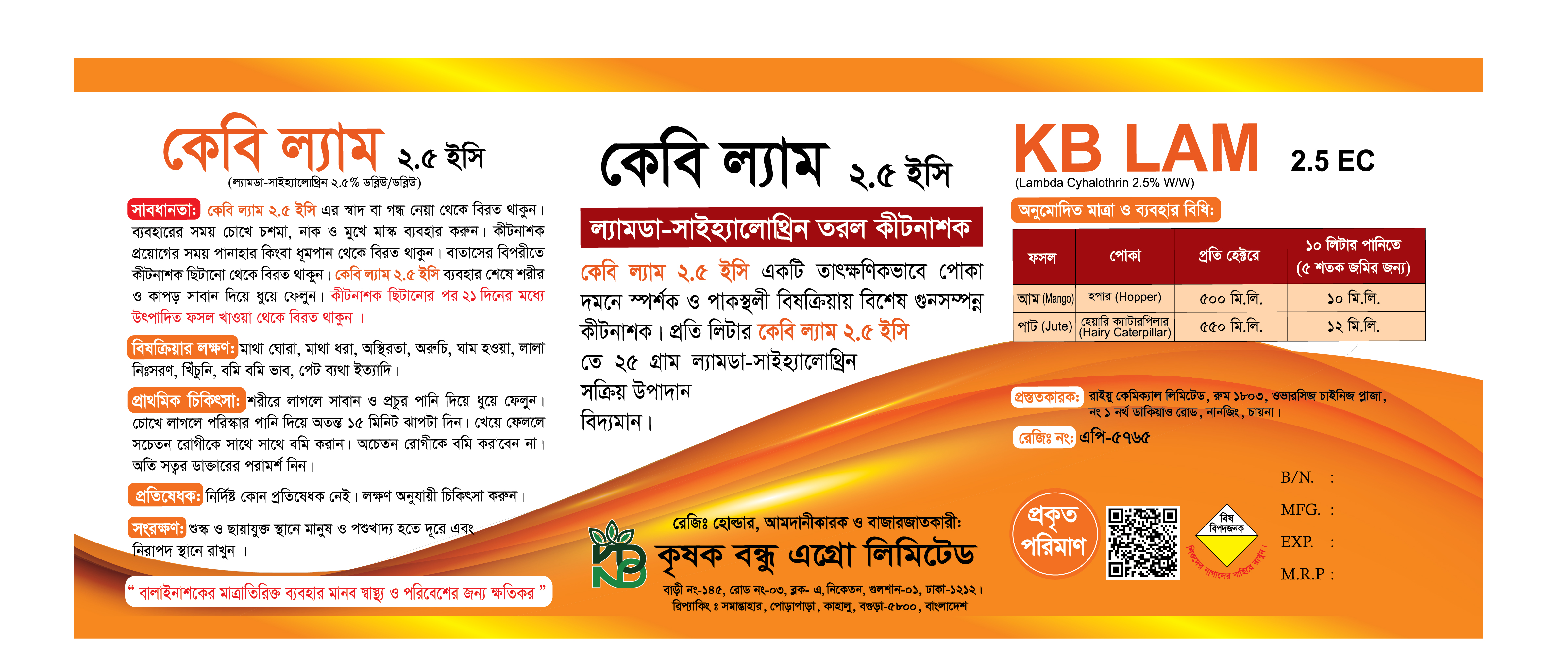 কেবি ল্যাম ২.৫ ইসি একটি তাৎক্ষণিকভাবে পোকা দমনে স্পর্শক ও পাকস্থলী বিষক্রিয়ায় বিশেষ গুনসম্পন্ন কীটনাশক। প্রতি লিটার কেবি ল্যাম ২.৫ ইসি তে ২৫ গ্রাম ল্যামডা-সাইহ্যালোথ্রিন সক্রিয় উপাদান বিদ্যমান।