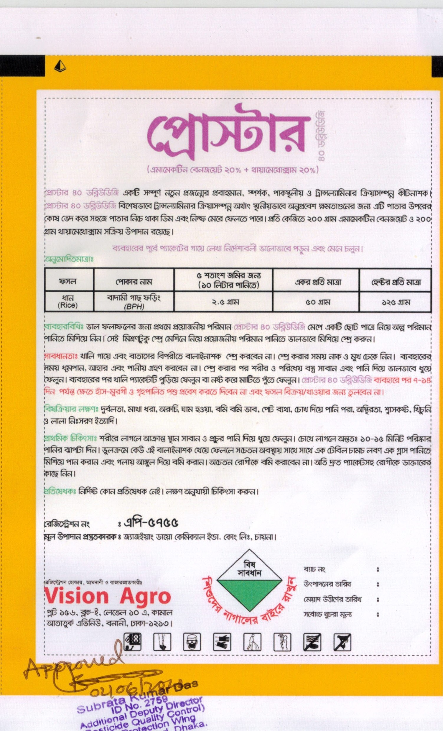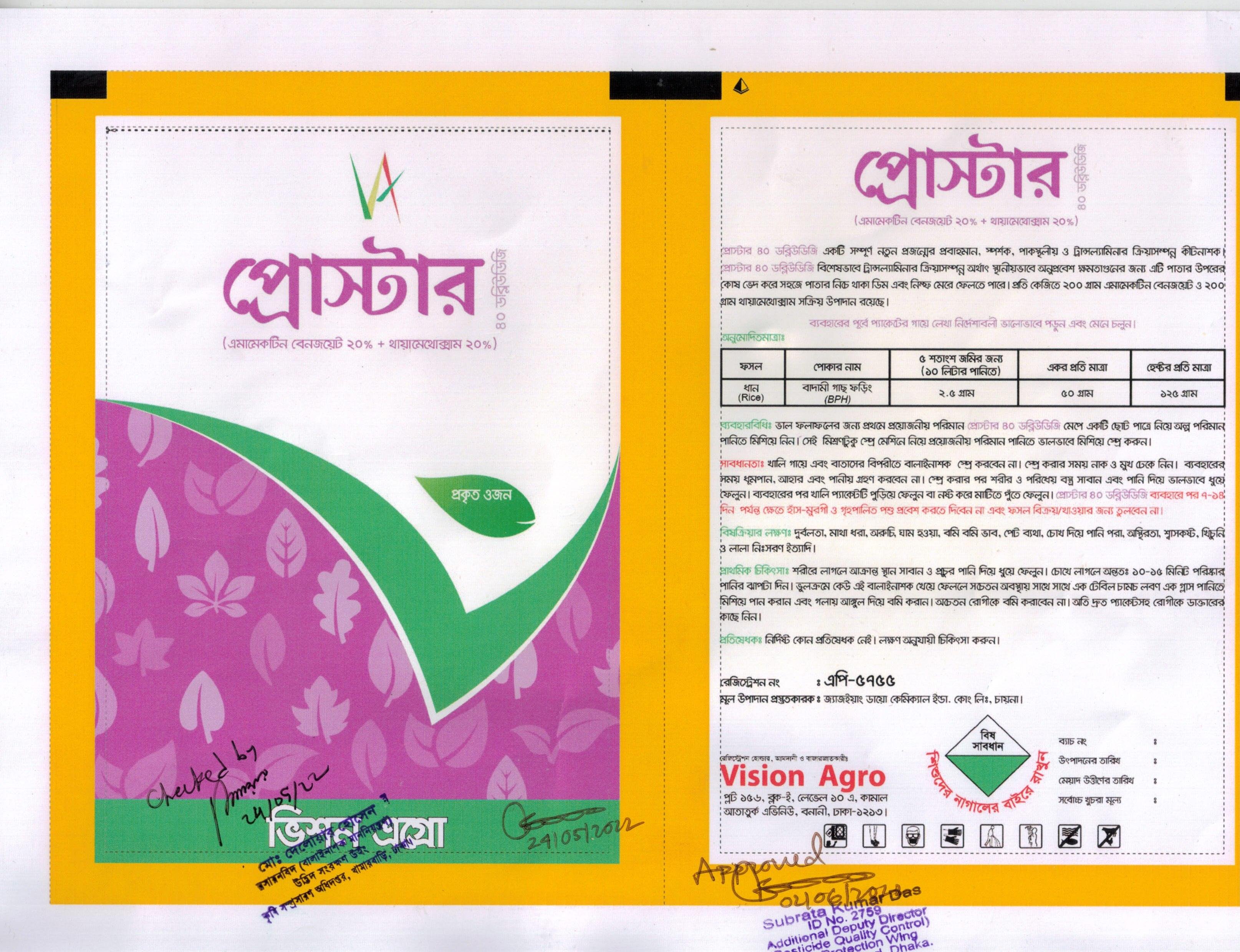 প্রোস্টার ৪০ ডব্লিউডিজি একটি সম্পূর্ণ নতুন প্রজন্মের প্রবাহমান, স্পর্শক, পাকস্থলীয় ও ট্রান্সলেমিনার ক্রিয়া সম্পন্ন কীটনাশক। প্রোস্টার ৪০ ডব্লিউডিজি বিশেষভাবে ট্রান্সলেমিনার ক্রিয়া সম্পন্ন অর্থাৎ স্থানীয়ভাবে অনুপ্রবেশ ক্ষমতা গুণের জন্য এটি পাতার উপরের কোষ ভেদ করে সহজে পাতার নিচে থাকার ডিম এবং নিমত মেরে ফেলতে পারে। ভালো ফলাফলের জন্য প্রথমে প্রয়োজনীয় পরিমাণ মেপে একটি ছোট পাত্র নিয়ে অল্প পরিমাণ পানিতে মিশিয়ে নিন সেই মিশ্রণ টুকু স্প্রে মেশিন নিয়ে প্রয়োজনীয় পরিমাণ পানিতে ভালোভাবে মিশিয়ে স্প্রে করুন