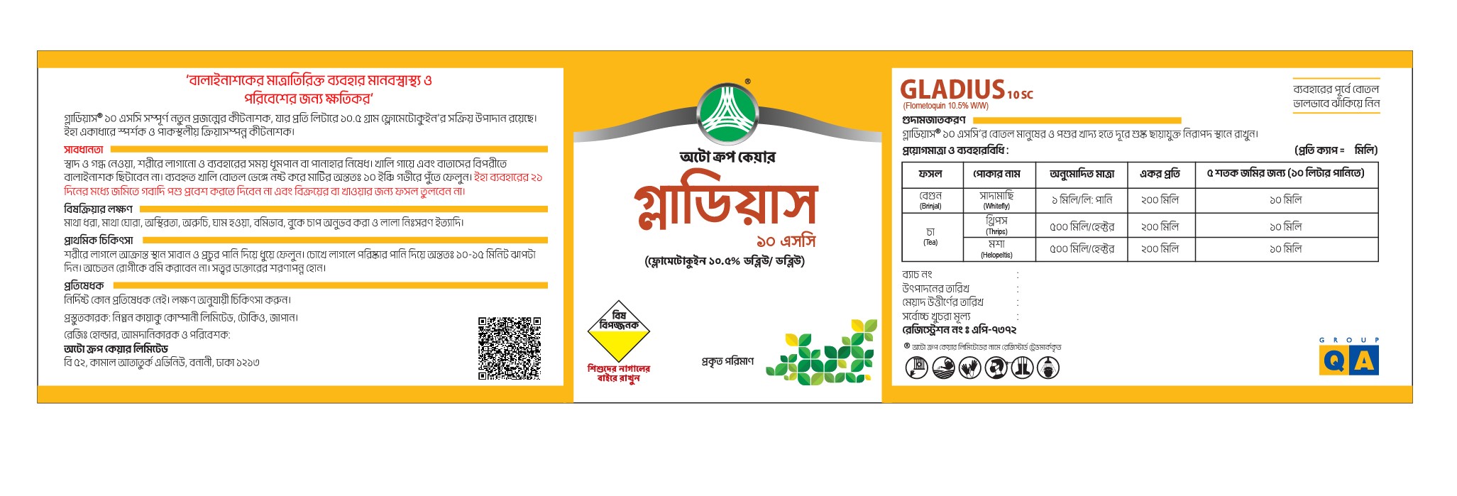 গ্লাডিয়াস®১০ এসসি সম্পূর্ণ নতুন প্রজন্মের কীটনাশক, যার প্রতি লিটারে ১০.৫ গ্রাম ফ্লোমেটোকুইন সক্রিয় উপাদান রয়েছে।ইহা একাধারে স্পর্শক ও পাকস্থলীয় ক্রিয়াসম্পন্ন কীটনাশক।