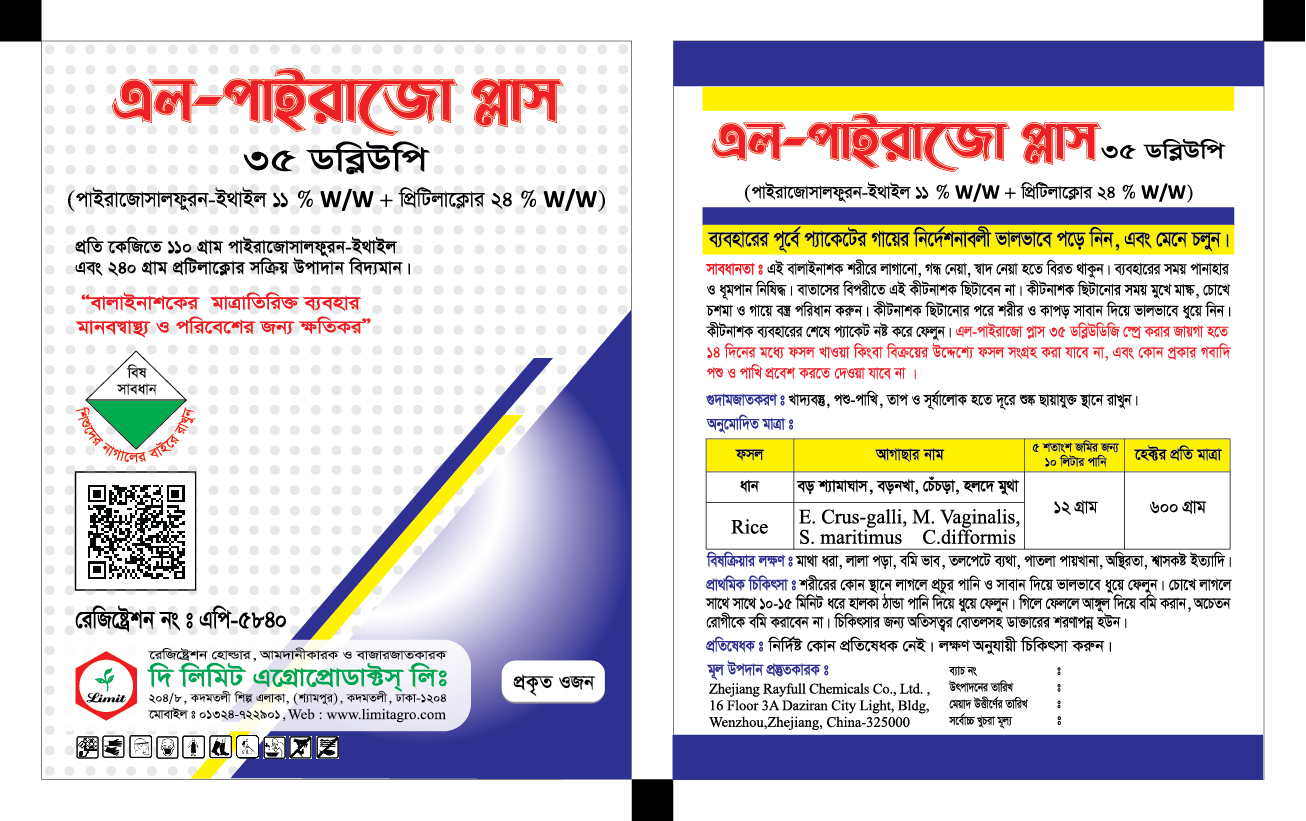 এল-পাইরাজো প্লাস ৩৫ ডব্লিউপি এর প্রতি লিটারে ১১০ গ্রাম পাইরাজোসালফুরন-ইথাইল এবং ২৪০ গ্রাম প্রিটিলাক্লোর স্বয়ংক্রিয় উপাদান বিদ্যমান। ইহা ধানের বড় শ্যামাঘাস, বড়নখা, চেঁচড়া, হলদে মুথা নামের আগাছা দমনে অধিক কার্যকরী।