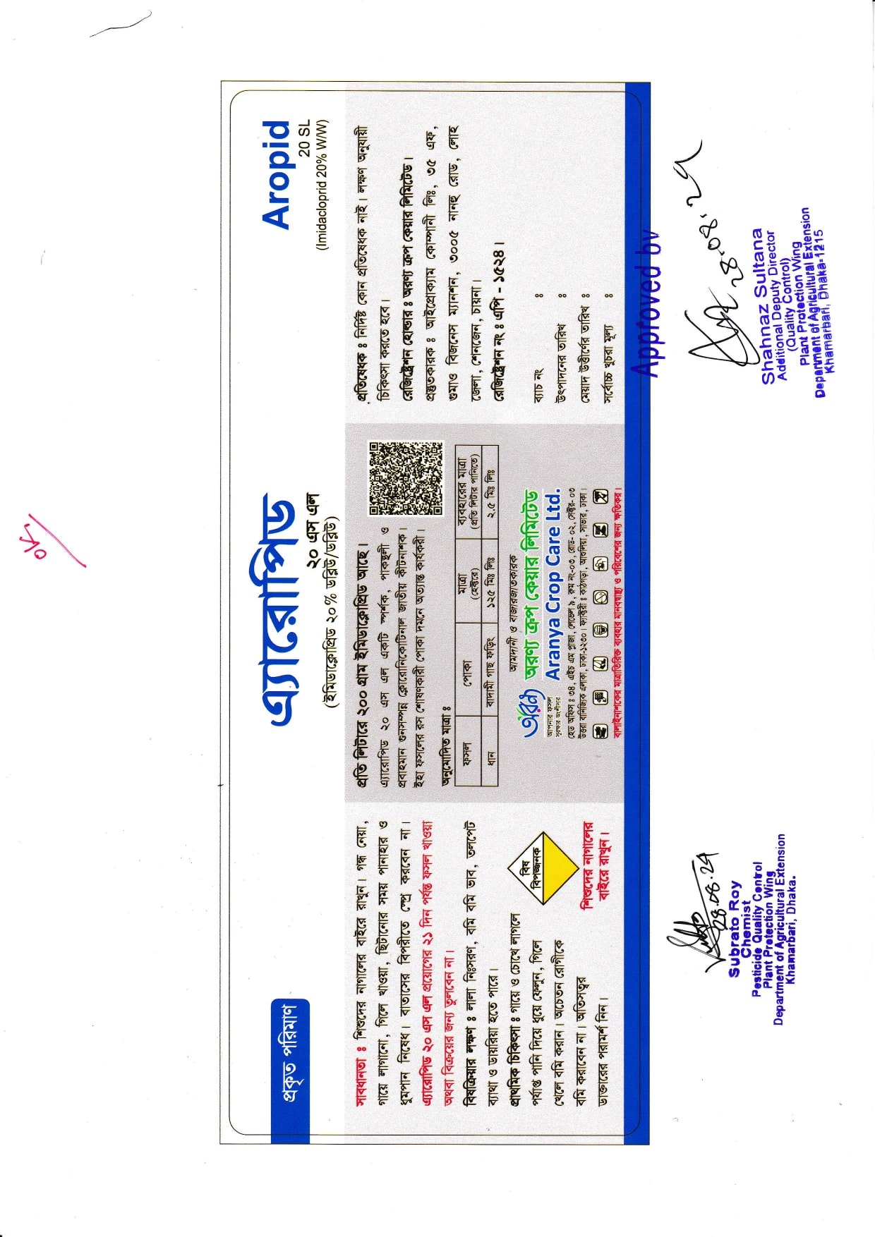 এ্যারোপিড 20 এস এল প্রয়োগের পর কমপক্ষে 14-21 দিন পর্যন্ত ফসল খাওয়া বা বিক্রয়ের জন্য তুলবেন না।