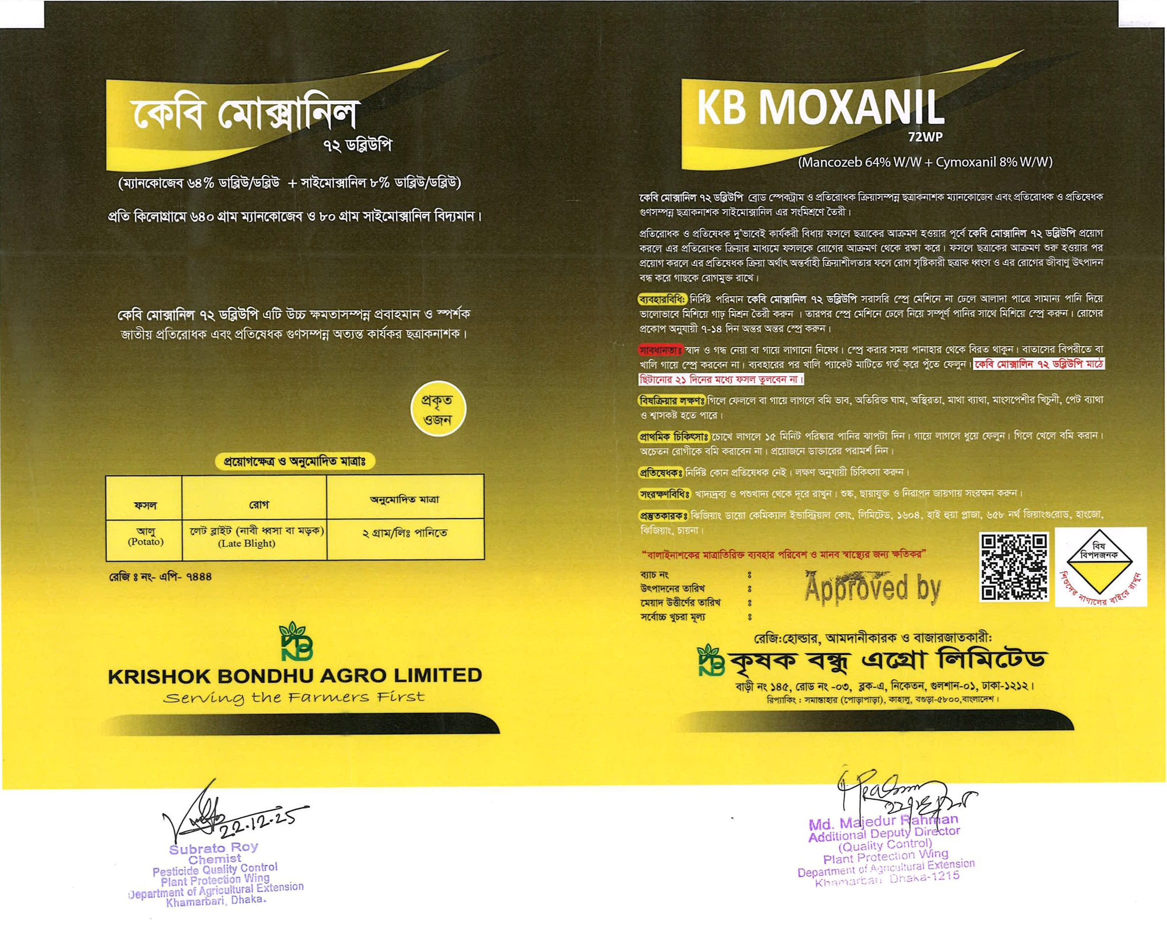 কেবি মোক্সানিল ৭২ ডব্লিউপি এটি উচ্চ ক্ষমতাসম্পন্ন প্রবাহমান ও স্পর্শক জাতীয় প্রতিরোধক এবং প্রতিষেধক গুণসম্পন্ন অত্যন্ত কার্যকর ছত্রাকনাশক। কেবি মোক্সানিল ৭২ ডব্লিউপি ব্রোড স্পেকট্রাম ও প্রতিরোধক ক্রিয়াসম্পন্ন ছত্রাকনাশক ম্যানকোজেব এবং প্রতিরোধক ও প্রতিষেধক গুণসম্পন্ন ছত্রাকনাশক সাইমোক্সানিল এর সংমিশ্রণে তৈরী। প্রতিরোধক ও প্রতিষেধক দু'ভাবেই কার্যকরী বিধায় ফসলে ছত্রাকের আক্রমণ হওয়ার পূর্বে কেবি মোক্সানিল ৭২ ডব্লিউপি প্রয়োগ করলে এর প্রতিরোধক ক্রিয়ার মাধ্যমে ফসলকে রোগের আক্রমণ থেকে রক্ষা করে। ফসলে ছত্রাকের আক্রমণ শুরু হওয়ার পর প্রয়োগ করলে এর প্রতিষেধক ক্রিয়া অর্থাৎ অন্তর্বাহী ক্রিয়াশীলতার ফলে রোগ সৃষ্টিকারী ছত্রাক ধ্বংস ও এর রোগের জীবাণু উৎপাদন বন্ধ করে গাছকে রোগমুক্ত রাখে।