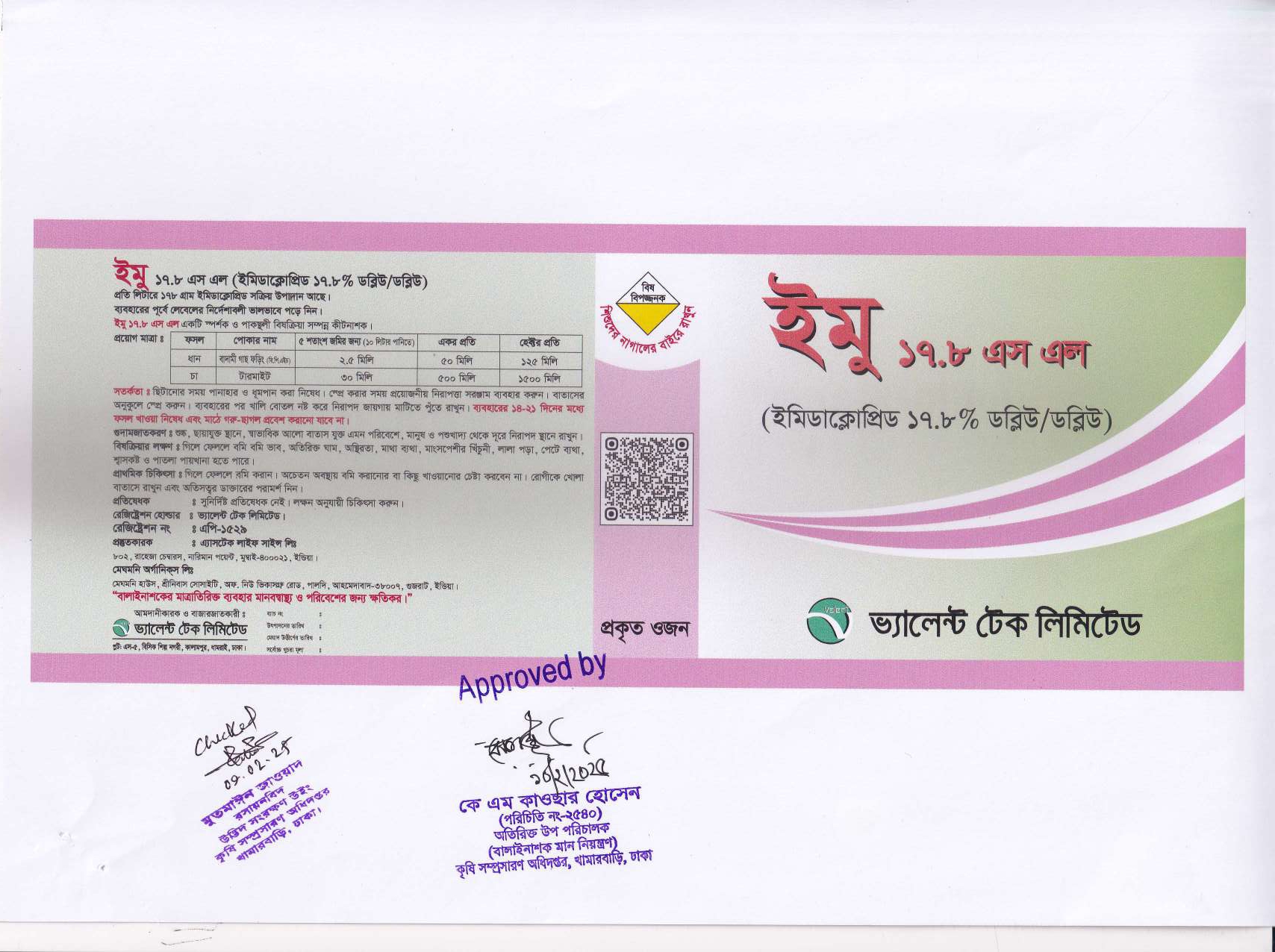 প্রতি লিটারে ১৭৮ গ্রাম ইমিডাক্লোপ্রিড সক্রিয় উপাদান আছে। ইমু ১৭.৮ এস এল একটি স্পর্শক ও পাকস্থলী বিষক্রিয়া সম্পন্ন কীটনাশক। যা ধান ও চা এর বাদামী গাছ ফড়িং ও টারমাইট দূর করতে ভালো গাজ করে।