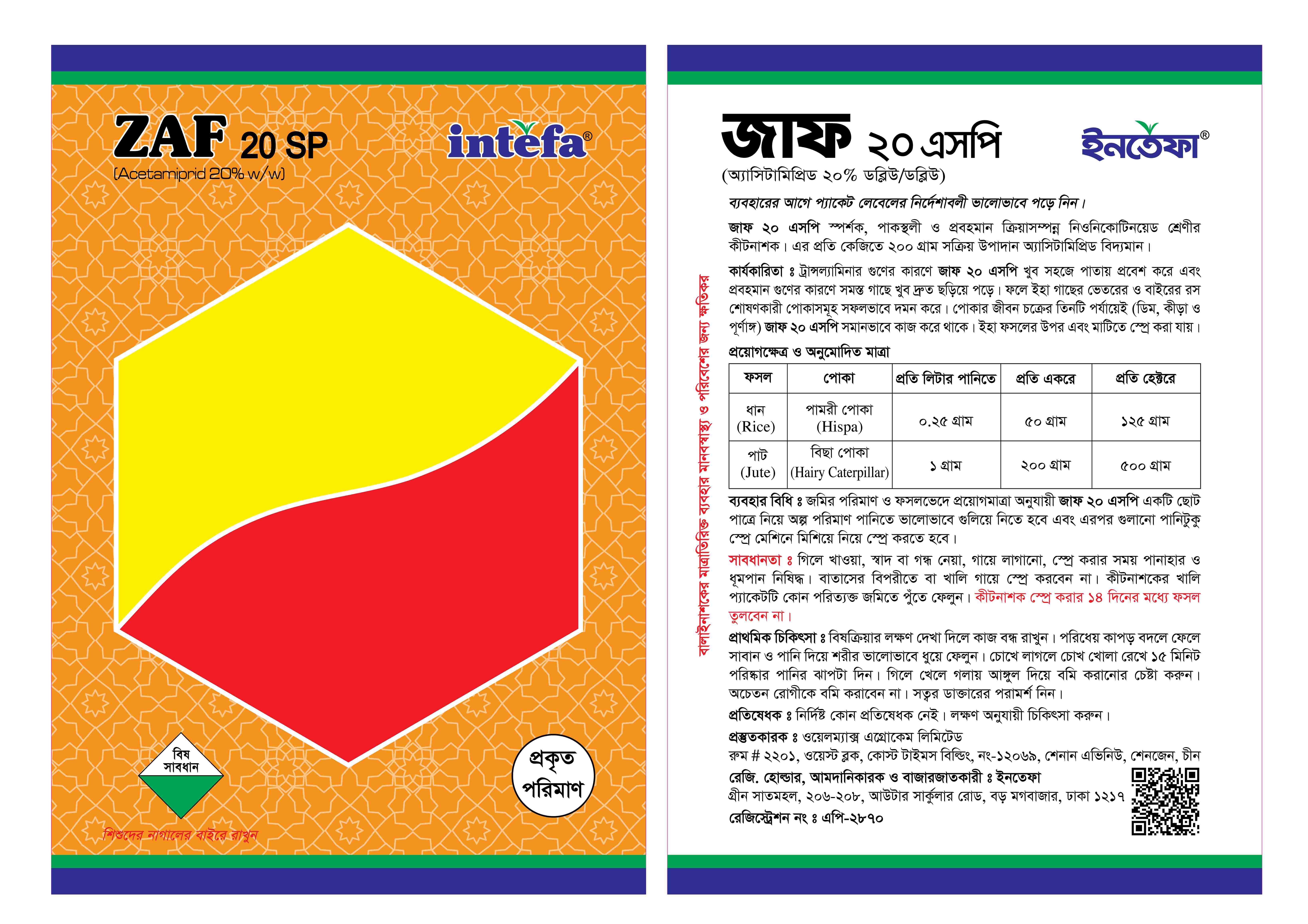 জাফ ২০ এসপি স্পর্শক, পাকস্থলী ও প্রবহমান ক্রিয়াসম্পন্ন নিওনিকোটিনয়েড শ্রেণীর কীটনাশক। এর প্রতি কেজিতে ২০০ গ্রাম সক্রিয় উপাদান অ্যাসিটামিপ্রিড বিদ্যমান।