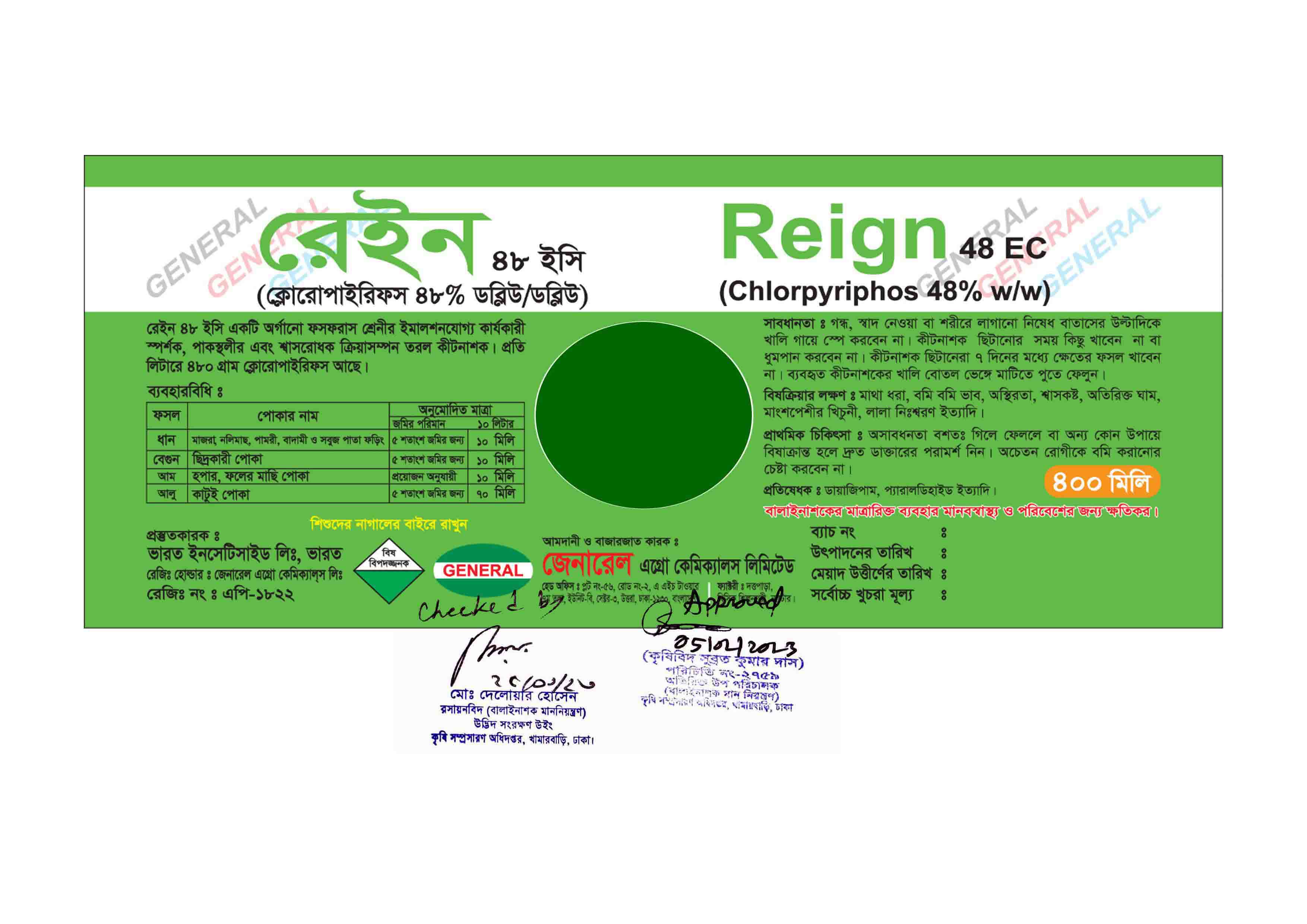 রেইন ৪৮ ইসি একটি অর্গানো ফসফরাস শ্রেনীর ইনালশনযোগ্য কার্যকরী স্পর্শক, পাকস্থলীয় এবং শ্বাসরোধক ক্রিয়াসম্পন্ন তরল কীটনাশক যা ধানের মাজরা, নালিমাছি, পামড়ী, বাদামী ও সবুজ পাতা ফড়িং ও বেগুনের ফল ছিদ্রকারী পোকা ও আমের হপার, ফলের মাছি পোকা এবং আলুর কাটুই পোকা দমনের জন্য বিশেষ উপযোগী।