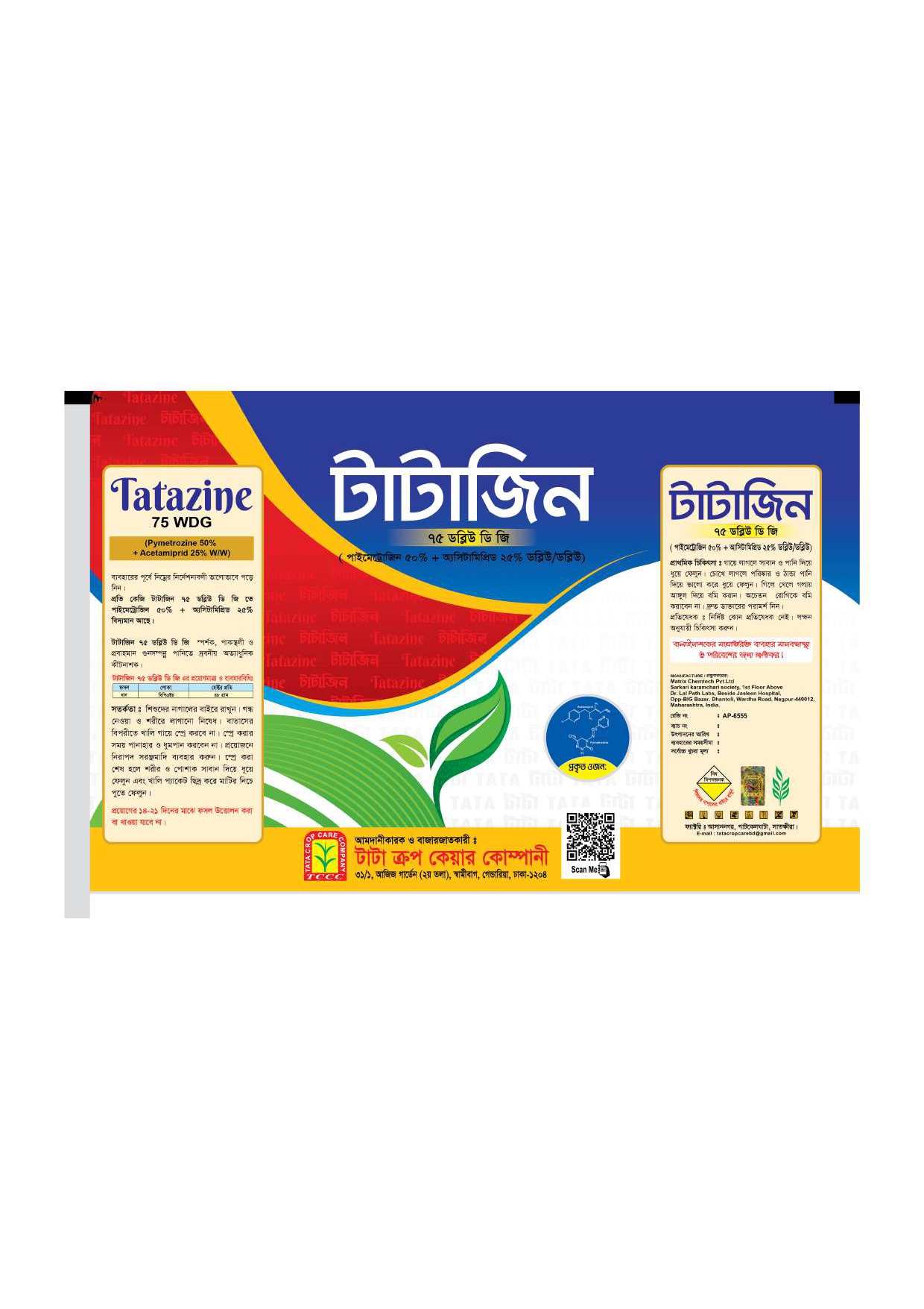টাটাজিন 75 ডব্লিউডিজি স্পশৃক, পাকস্থলী ও প্রবাহমান গুন সম্পন্ন পানিতে দ্রবনীয় অত্যাধুনিক বালাইনাশক। টাটাজিন 75 ডব্লিউডিজি ধান এর বাদামী ঘাস ফড়িং/ক্যারেন্ট পোকা দমনের জন্য 48 গ্রাম প্রতি হেক্টরে প্রয়োগ করতে হবে। প্রয়োগের পর 14 দিন পর্যন্ত কার্যকারী থাকে।