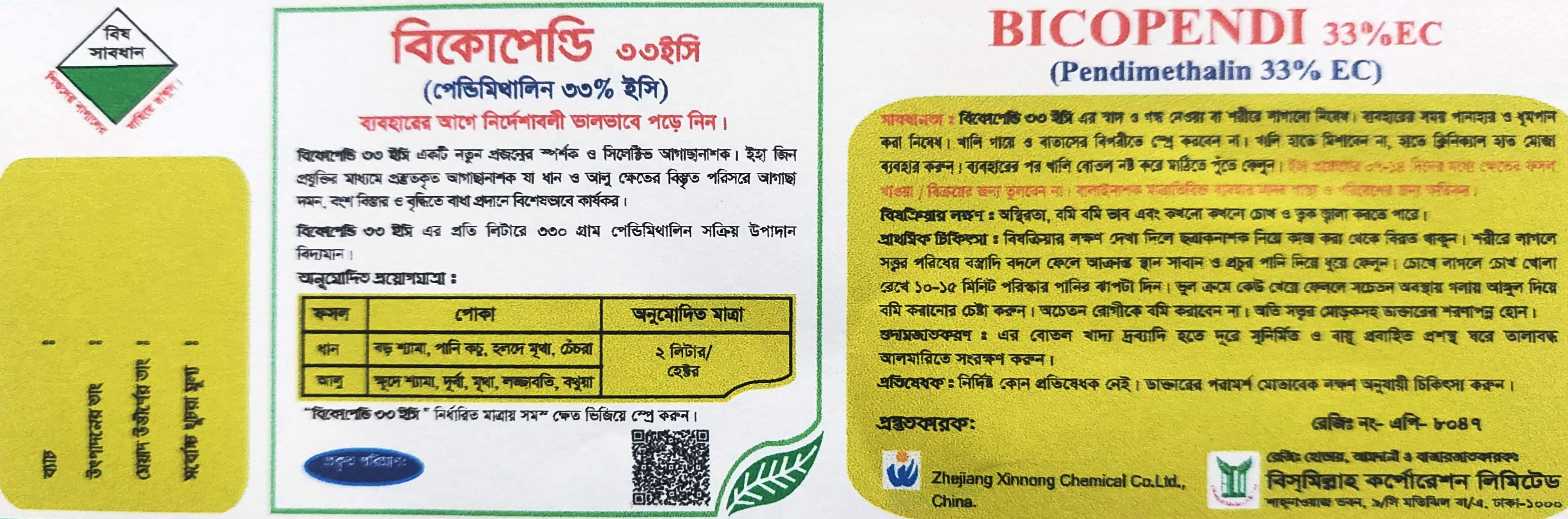 বিকোপেন্ডি ৩৩ ইসি একটি নতুন প্রজন্মের স্পর্শক ও সিলেক্টিভ আগাছানাশক। ইহা জিন প্রযুক্তির মাধ্যমে প্রস্তুতকৃত আগাছানাশক যা ধান ও আলু ক্ষেতের বিস্তৃত পরিসরে আগাছা দমন, বংশ বিস্তার ও বৃদ্ধিতে বাধা প্রদানে বিশেষভাবে কার্যকর। বিকোপেন্ডি ৩৩ ইসি এর প্রতি লিটারে ৩৩০ গ্রাম পেন্ডিমিথালিন সক্রিয় উপাদান বিদ্যমান।