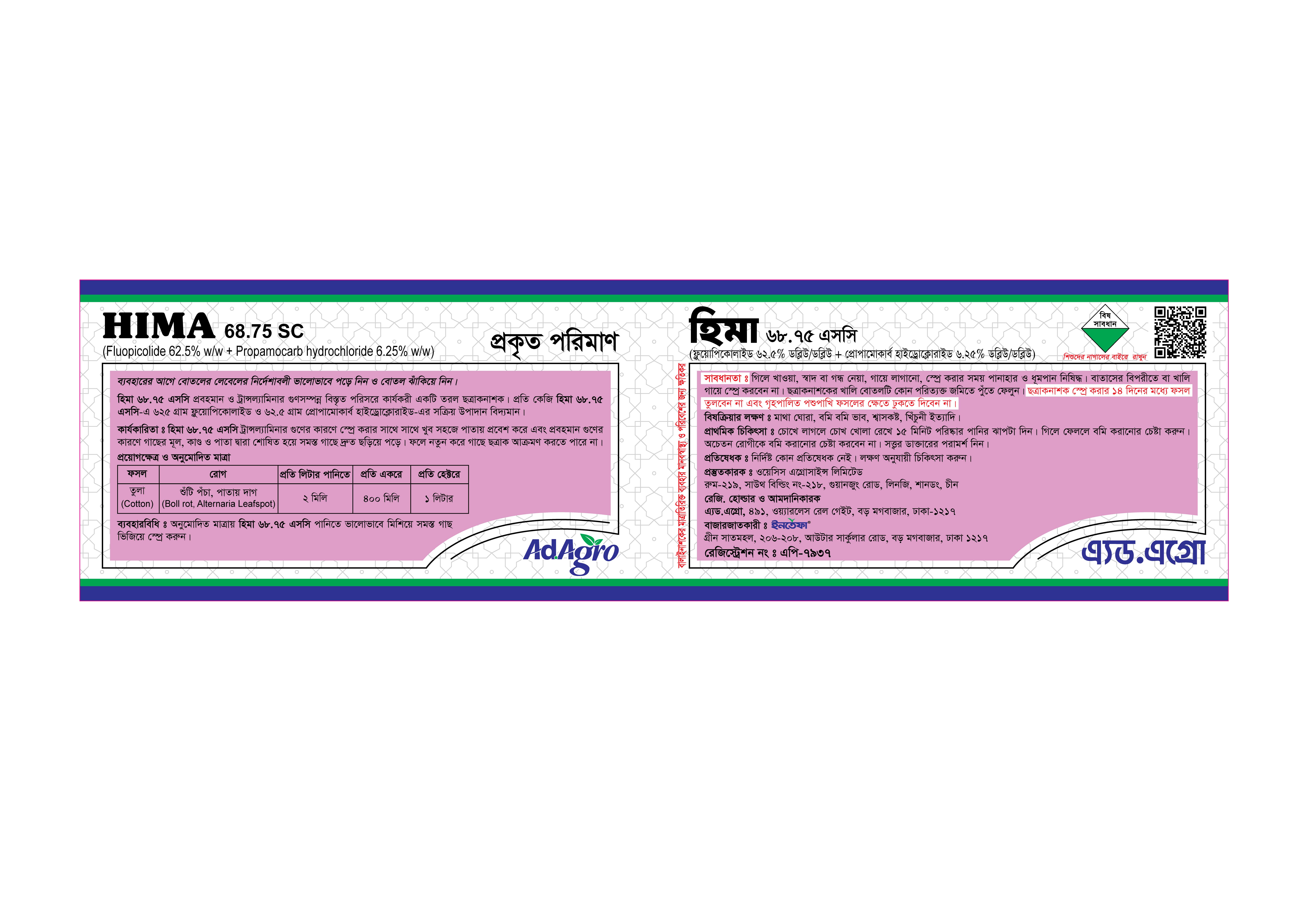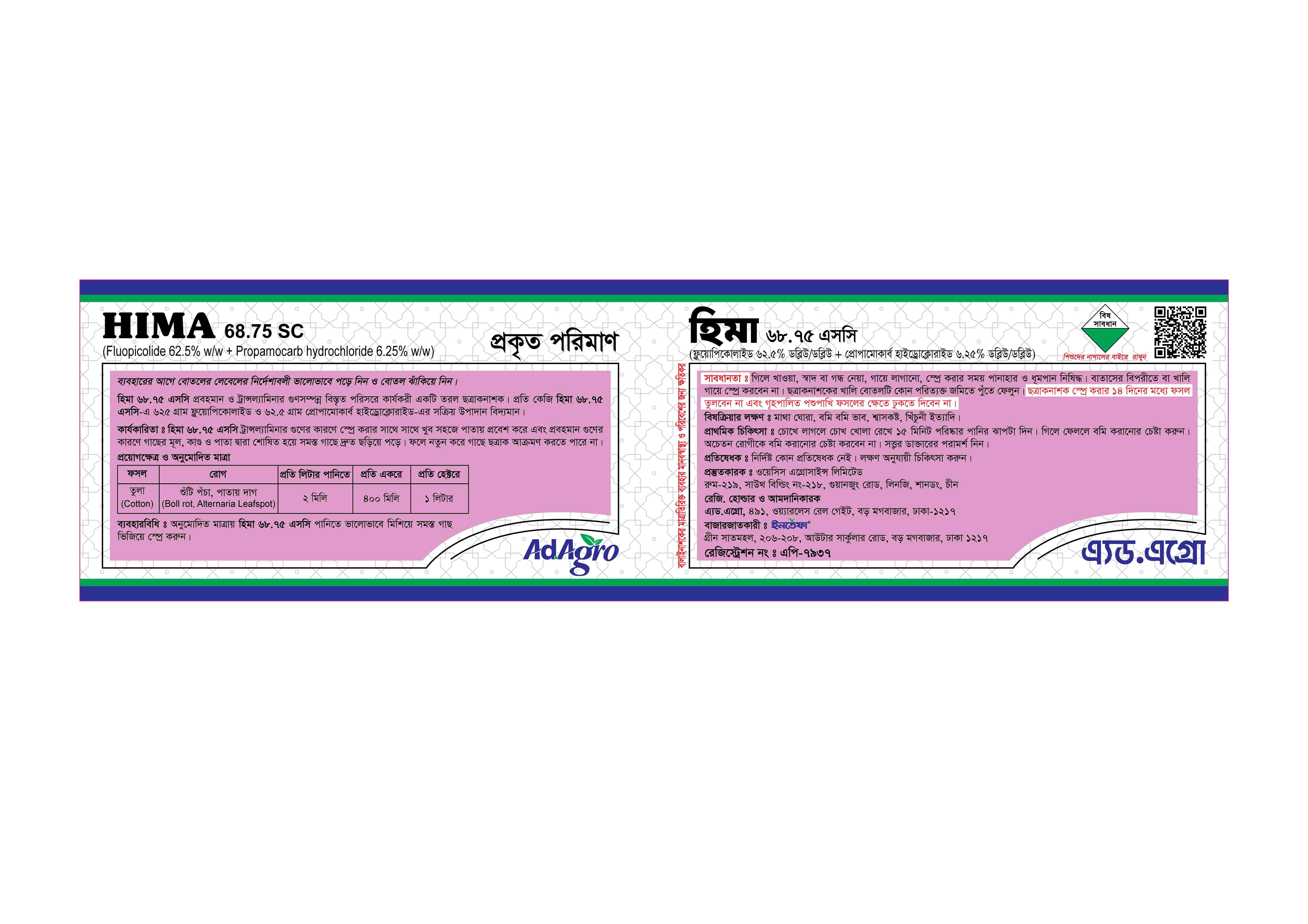 অনুমোদিত মাত্রায় হিমা ৬৮.৭৫ এসসি পানিতে ভালোভাবে মিশিয়ে সমস্ত গাছ ভিজিয়ে স্প্রে করুন।