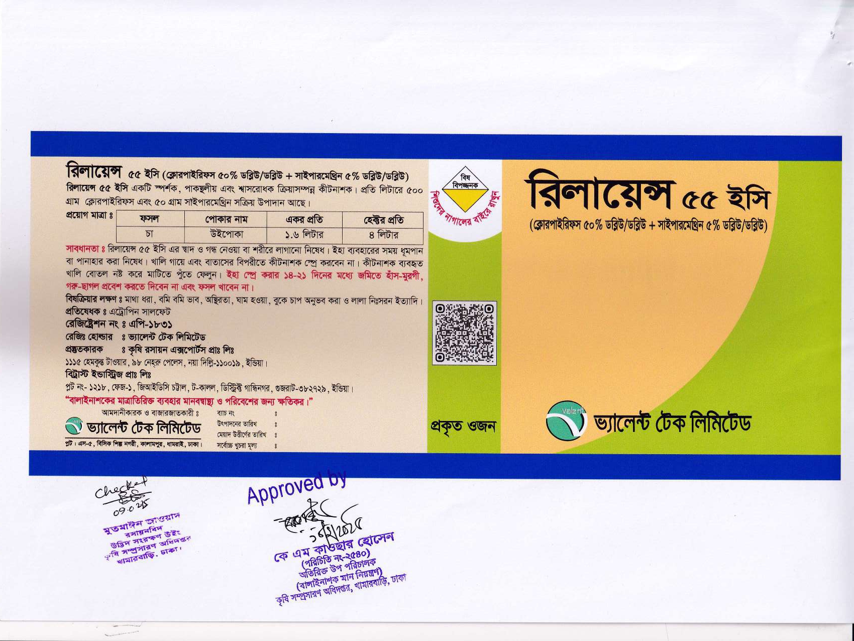 রিলায়েন্স ৫৫ ইসি একটি স্পর্শক, পাকস্থলীয় এবং শ্বাসরোধক ক্রিয়াসম্পন্ন কীটনাশক। প্রতি লিটারে ৫০০ গ্রাম ক্লোরপাইরিফস এবং ৫০ গ্রাম সাইপারমেথ্রিন সক্রিয় উপাদান আছে। যা চায়ের উইপোকা দমনে কার্যকরী।