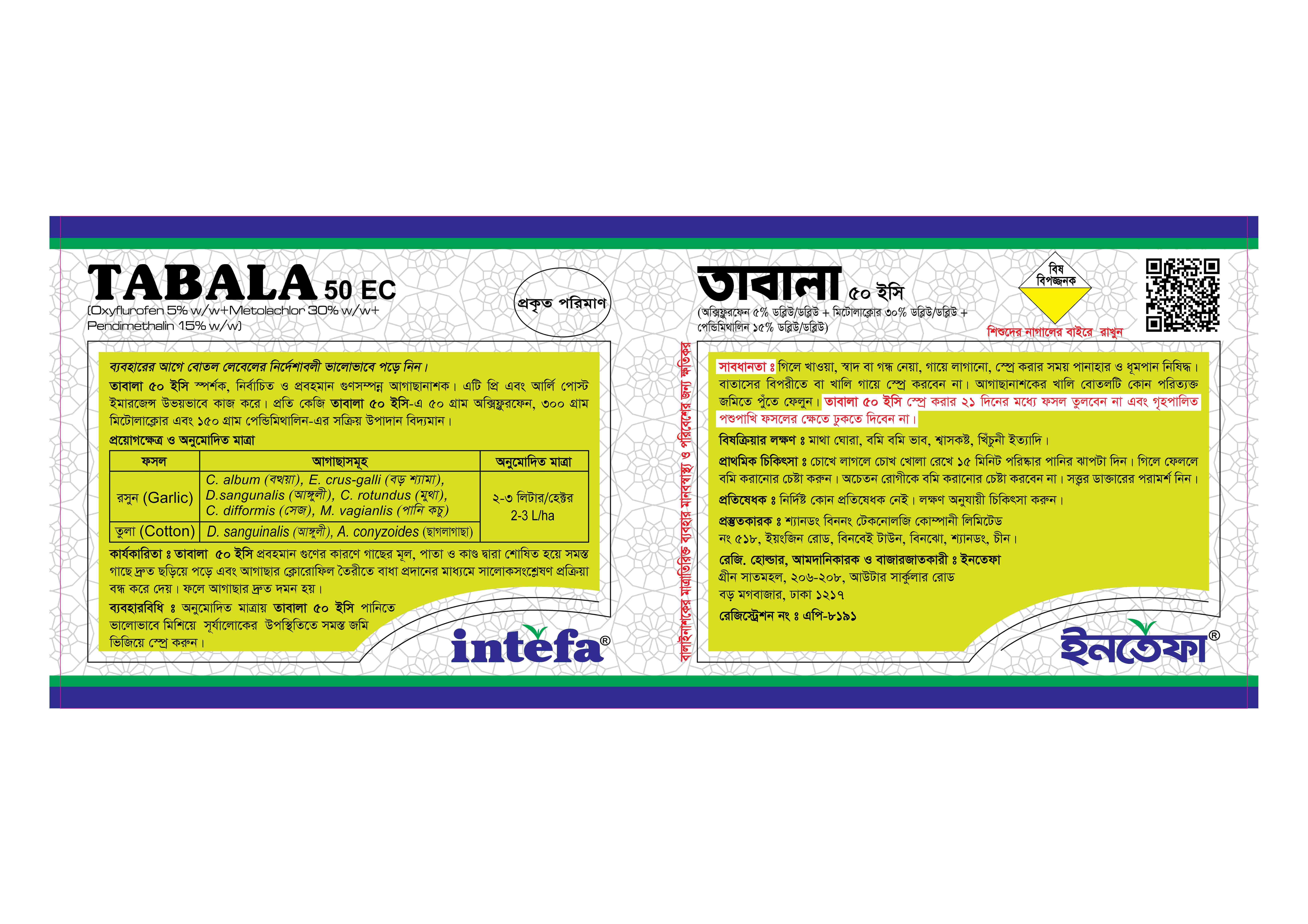 তাবালা ৫০ ইসি স্পর্শক, নির্বাচিত ও প্রবহমান গুণসম্পন্ন আগাছানাশক। এটি যি এবং আর্লি পোস্ট ইমারজেন্স উভয়ভাবে কাজ করে।