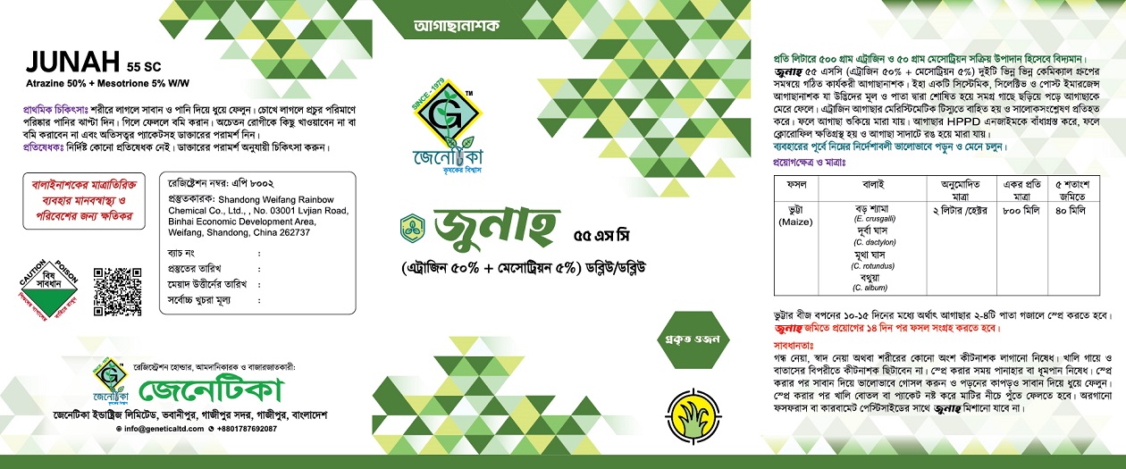 লেবেলে বর্ণিত ফসলের বালাই দমনে জুনাহ ৫৫ এস সি কার্যকরী ও অনুমোদিত।