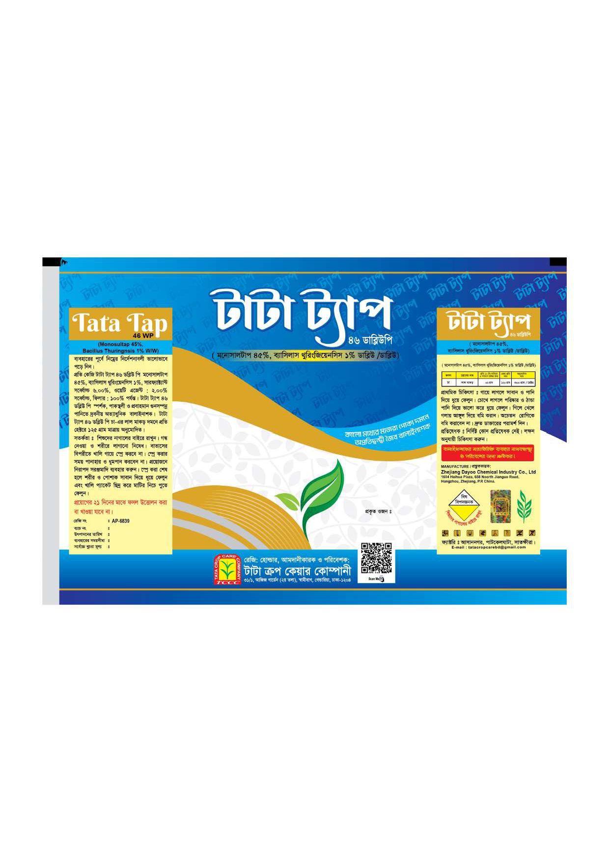 টাটা ট্যাপ 46 ডব্লিউপি স্পশৃক, পাকস্থলী ও প্রবাহমান গুন সম্পন্ন পানিতে দ্রবনীয় অত্যাধুনিক বালাইনাশক। টাটা ট্যাপ 46 ডব্লিউপি চা এর লাল মাকড় দমনে প্রতি হেক্টরে 300 গ্রাম মাত্রায় অনুমোদিত। প্রয়োগের পর 21 দিন পর্যন্ত কার্যকারী থাকে।