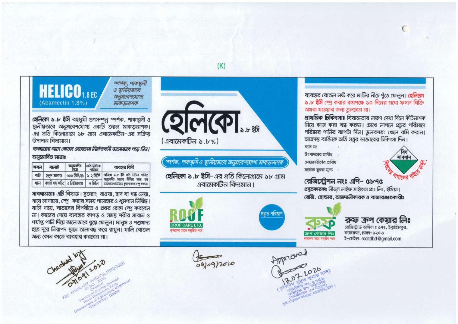 ফসল- পাট, বালাই- হলুদ মাকড়, অনুমোদিত মাত্রা- ৬০০ মিলি/হে., প্রতি লিটার পানিতে- ১.২ মিলি ফসল- ধান, বালাই- বাদামী গাছ ফড়িং, অনুমোদিত মাত্রা- ১ লিটার/হে., প্রতি লিটার পানিতে- ২ মিলি