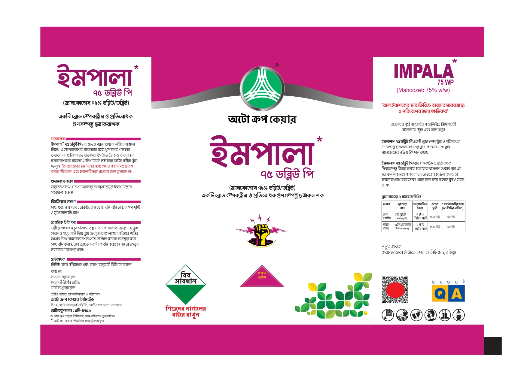 ১.ফসল:মরিচ রোগের নাম:এনথ্রাকনোজ অনুমোদিত মাত্রা:২ গ্রাম/লিটার পানি একর প্রতি:৪০০ গ্রাম ৫ শতক জমির জন্য (১০ লি পানিতে):২০ গ্রাম ২.ফসল:আলু রোগের নাম:লেট ব্লাইট অনুমোদিত মাত্রা:২ গ্রাম/লিটার পানি একর প্রতি:৪০০ গ্রাম ৫ শতক জমির জন্য (১০ লি পানিতে):২০ গ্রাম