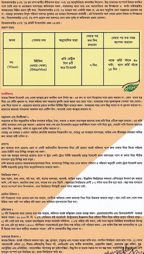 সতর্কীকরণঃ অত্যন্ত বিষাক্ত ট্যাবলেট এবং খোলা অবস্থায় দ্রুত ফসফিন গ্যাস নির্গত হয়। এর কণা বা গ্যাস নিঃশ্বাসের সাথে গ্রহণ করবেন না। কোন ধাতব যন্ত্র দিয়ে এর কৌটা খুলবেন না, কারণ ঘর্ষনের ফলে আগুনের ফুলকি থেকে আগুন ধরে যেতে পারে। ব্যবহারের সময় সুরক্ষামূলক পোশাক পরে নেবেন। একা দিতে যাবেন না। প্রয়োগের জায়গায় ঢুকতে ফসফিন ডিটিক্টর স্ট্রিপ ব্যবহার করুন। ব্যবহারের সময় কোন কিছু খাবেন না বা ধুমপান করবেন না। প্রয়োগের জায়গায় সাবধানতা অবলম্বন করে নোটিশ দিন। কখনোই খোলা অবস্থায় রাখবেন না। মজুদকাল এবং বিনস্টিকরণ: বাচ্চাদের বা বিনা অনুমোদিত ব্যক্তির নাগালের বাহিরে, ঠান্ডা, শুকনো ও আলো-বাতাসযুক্ত জায়গায় তালা চাবি দিয়ে এটিকে মজুদ রাখবেন। এর খালি কৌটা ভালভাবে দোষ-মুক্ত করবেন। প্রয়োগের কাজ শেষ হলে ট্যাবলেটের গুড়োর অবশিষ্টাংশ সাবান পানি দিয়ে ধুয়ে, ধোয়ানি পানি নিরাপদ জায়গায় ফেলে দিন। জলধারা, নর্দমা বা পুকুর-নালা দুষিত করবেন না। যেহেতু এর ব্যবহার ও প্রয়োগ পদ্ধতির কোনটাই আমাদের নিয়ন্ত্রণাধীন নয়, সেহেতু এর ব্যবহারে মালপত্রের, ব্যক্তির এবং জীবজন্তর কোনরূপ ক্ষতির জন্য আমরা দায়ী থাকিব না। বিষক্রিয়ার লক্ষণঃ মাথা যন্ত্রণা, মাথা ঘোরা, বমি ভাব, বমি, কানের তালাধরা, শ্বাসকষ্ট, আন্ত্রিক যন্ত্রণা। উল্লেখিত বিষক্রিয়ার লক্ষণের বেশিমাত্রার উপসর্গ হল শুকনো কাশি, পেট খারাপ, অত্যধিক তৃষ্ণা বোধ, অত্যন্ত ঘাম এবং খিঁচুনী। অল্পমাত্রায় বিষক্রিয়ার রোগী ১–২ ঘন্টার মধ্যে ঠিক হয়ে যাবে। অল্প সময় ব্যবধানে আবার সংস্পর্শে আশা বিপদজনক। তবে বিষক্রিয়ার দীর্ঘস্থায়ী প্রভাব ঘটার সম্ভাবনা নেই। প্রাথমিক চিকিৎসাঃ যদি নিঃশ্বাসের সাথে ভেতরে চলে যায় তাহলে, রোগীকে অবিলম্বে খোলা জায়গায় নিয়ে গিয়ে উষ্ণতার আরামে রাখুন। আর পেটে চলে গেলে লবন মিশ্রিত গরম পানি পান করিয়ে বমি করান এবং অবিলম্বে হাসপাতালে নিয়ে যান। প্রতিষেধক: ১) যদি নিঃশ্বাসের সাথে ভেতরে চলে যায় তাহলে, অবিলম্বে যথেষ্ট অক্সিজেন দেয়ার ব্যবস্থা করুন। ব্রংকোডায়ালেটর এবং ডিকনজেস্ট্যান্ট ব্যবহার করতে পারেন। ৫০-১০০ সি. সি. ৭.৫% সোডিয়াম বাই কার্বোনেট ইনট্রতেনাস্ ইঞ্জেকশন দিয়ে বাইল্স টিউব দিয়ে খাইয়ে প্রস্রাব পরিস্কার রাখুন। ২) যদি পেটে চলে যায়, তাহলে বমনোদ্রেকর কপার সালফেন্ট সলিউশন ০.২% খাইয়ে বমি করান, দেই সাথে অদ্রাব্য কিউপ্রিক ফসফাইডের উৎপন্ন হয় এবং এটা দূর করতে ১:৫০০০ পটাশিয়াম পারম্যাঙ্গানেট দ্রবন দিয়ে দাস্ত করিয়ে পেট পরিস্কার করান। এক আউন্স মিল্ক অফ ম্যাগনেসিয়া বা ২/৩ টি ডিমের সাদা অংশ ফাটিয়ে খাওয়াতে পারেন। চর্বি বা তেলজাতীয় কিছু দেবেন না। ডাক্তারের উদ্দেশ্যেঃ অত্যন্ত বিষাক্