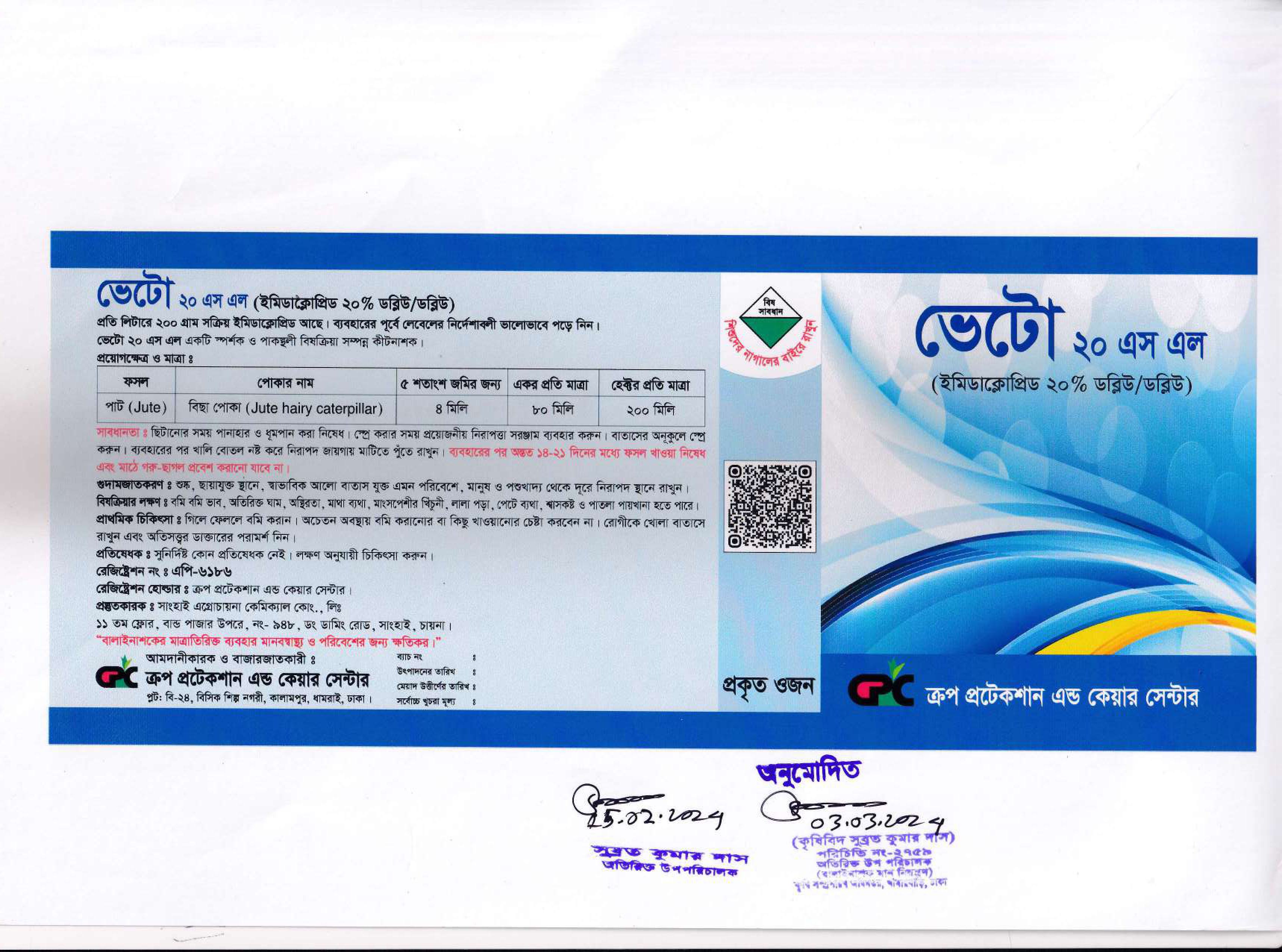 ভেটো ২০ এস এল একটি স্পর্শক ও পাকস্থলী বিষক্রিয়া সম্পন্ন কীটকনাশক। যা ব্যবহারে পাটের বিছা পোকা দমন করা সম্ভব।