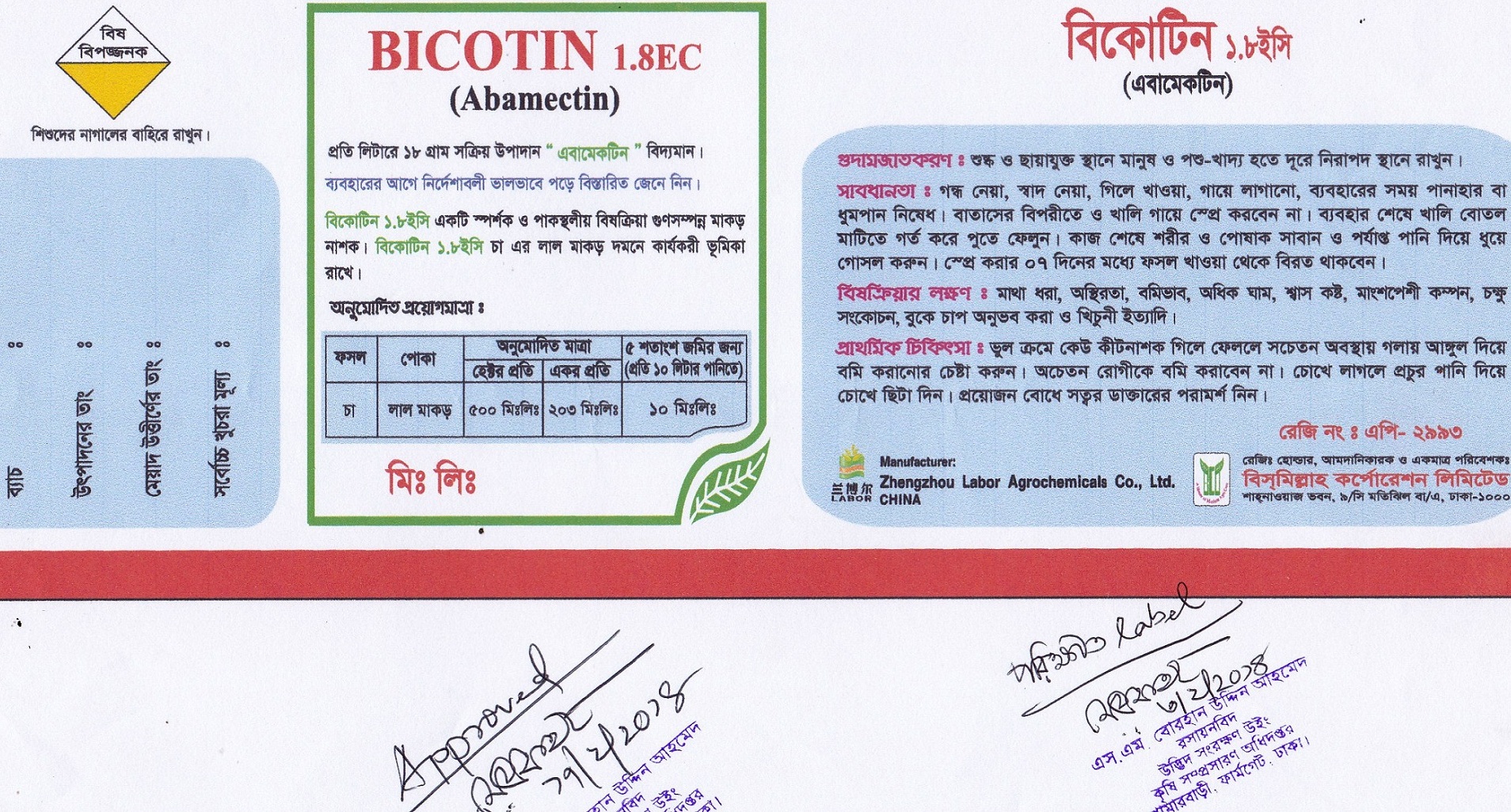 ফসল – চা, পোকা - লাল মাকড়, অনুমোদিত মাত্রাঃ হেক্টর প্রতি ৫০০ মিঃ লিঃ, একর প্রতি ২০৩ মিঃ লিঃ, ১০ মিঃ লিঃ / (প্রতি ১০ লিটার পানিতে) ৫ শতাংশ জমির জন্য।