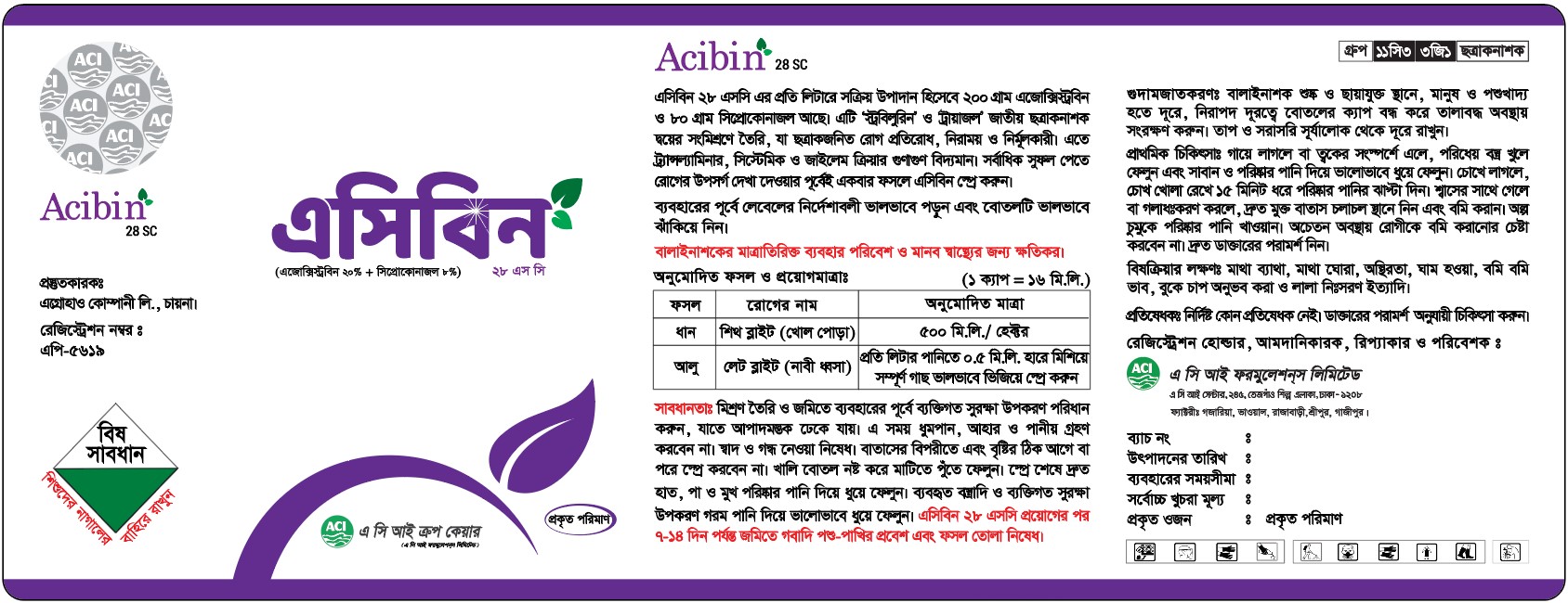 500 ml/ha for Rice and 0.5 ml per liter of water for Potato and spray thoroughly soaking the entire plant. For maximum benefit, spray Acibin on the crop once before disease symptoms appear.