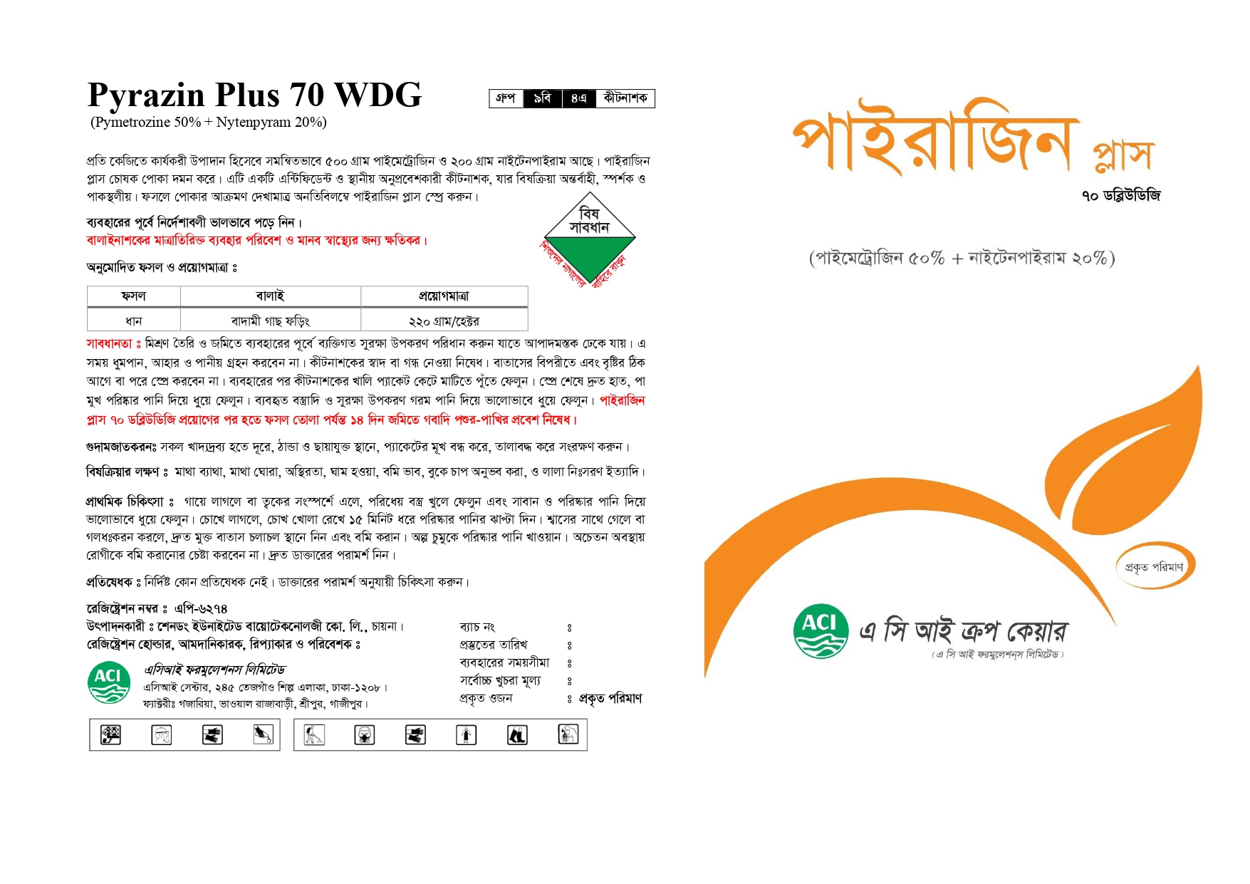 Pyrazin Plus suppresses sucking insects. It is an antifeedant and local penetrating insecticide, its toxicity is internal, tactile and gastrointestinal. Spray Pyrazin Plus as soon as you see insect infestation on the crop.