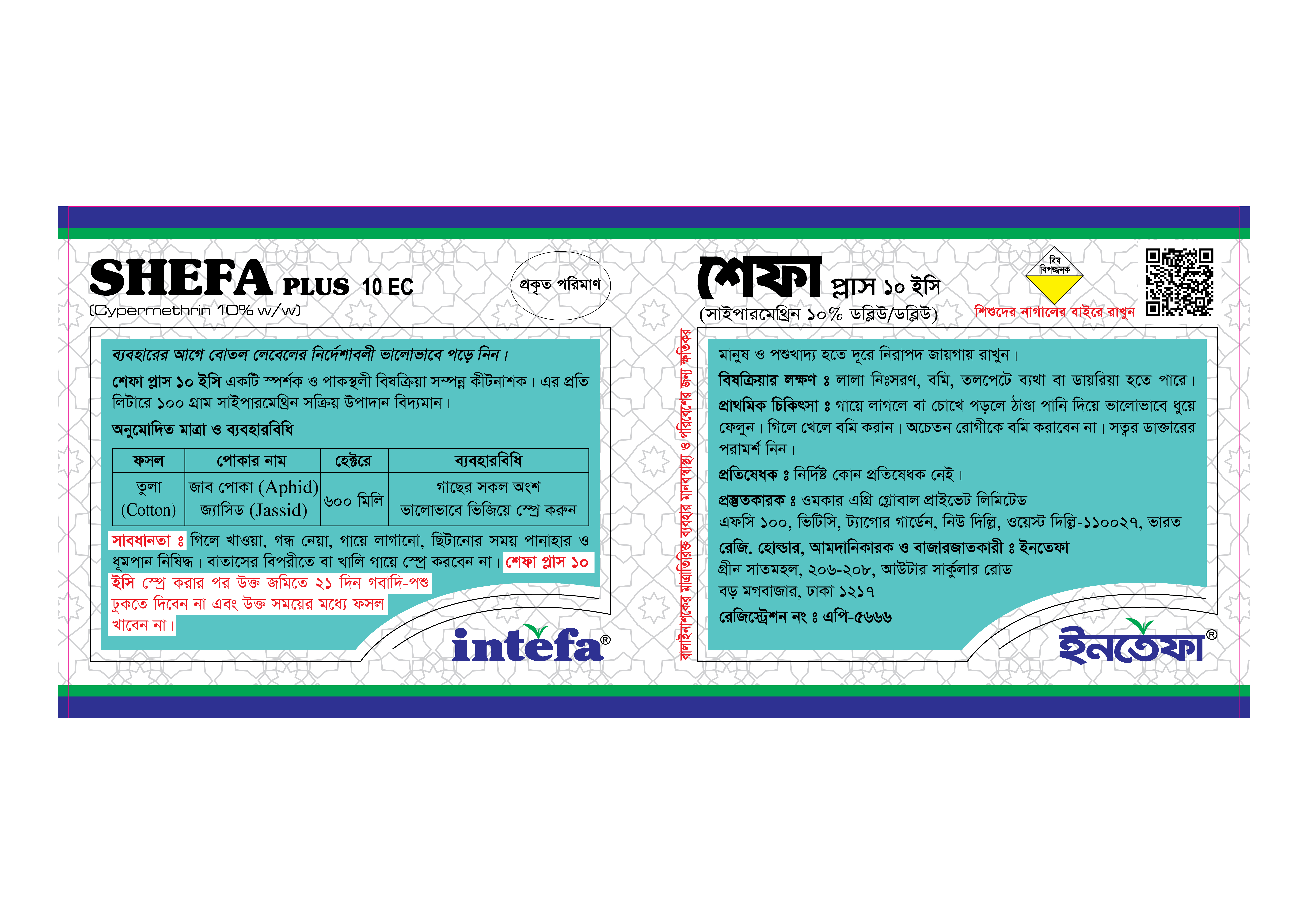 শেফা প্লাস ১০ ইসি একটি স্পর্শক ও পাকস্থলী বিষক্রিয়া সম্পন্ন কীটনাশক। এর প্রতি লিটারে ১০০ গ্রাম সাইপারমেথ্রিন সক্রিয় উপাদান বিদ্যমান।