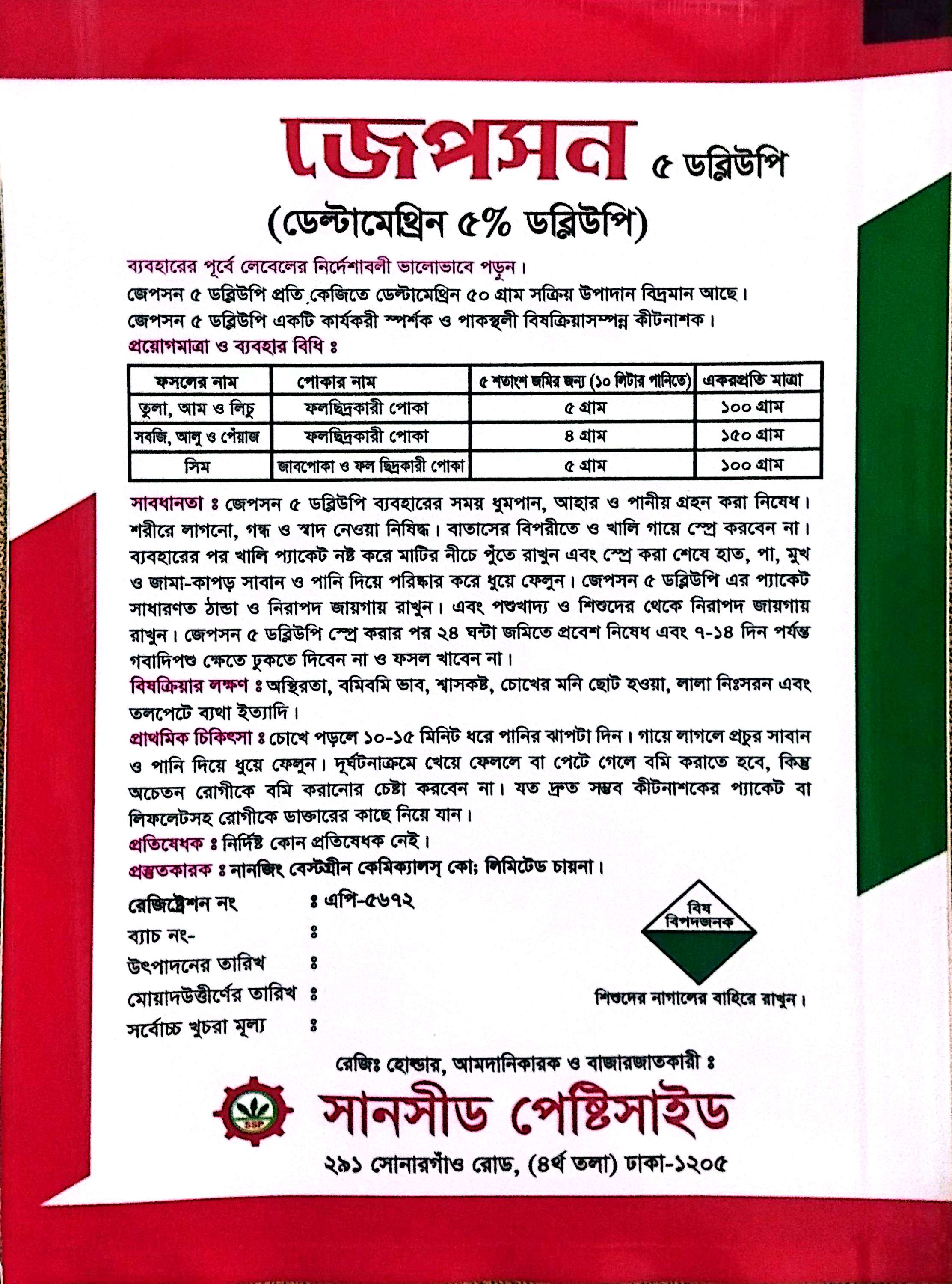 জেপসন- ৫ ডব্লিউ পি তুলা, আম, লিচু, সবজি, আলু, পিয়াজ এর ফল ছিদ্রকারী পোকা , সিমের জাব পোকা ও ফল ছিদ্রকারী পোকা দমনে অত্যন্ত কার্যকর ।