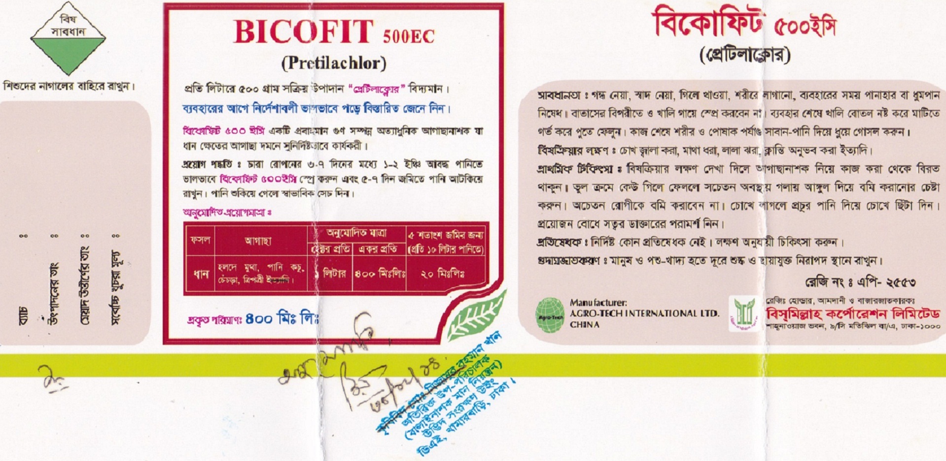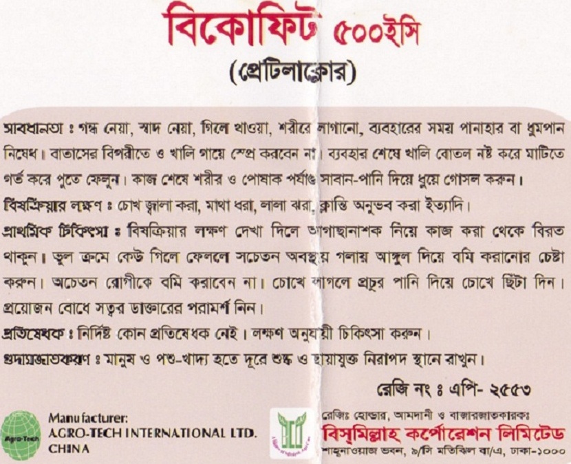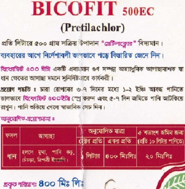ফসল - ধান, আগাছার নাম - হলদে মুথা, পানি কচু, চেঁচড়া, ত্রিপত্রী ইত্যাদি। অনুমোদিত মাত্রাঃ ২০ মিঃ লিঃ / (প্রতি ১০ লিটার পানিতে) ৫ শতাংশ জমির জন্য। হেক্টর প্রতি ১ লিটার, একর প্রতি ৪০০ মিঃ লিঃ। প্রয়োগ পদ্ধতি: চারা রোপনের ৩–৭ দিনের মধ্যে ১–২ ইঞ্চি আবদ্ধ পানিতে ভালভাবে বিকোফিট ৫০০ ইসি স্প্রে করুন এবং ৫–৭ দিন জমিতে পানি আটকিয়ে রাখুন। পানি শুকিয়ে গেলে স্বাভাবিক সেচ দিন।