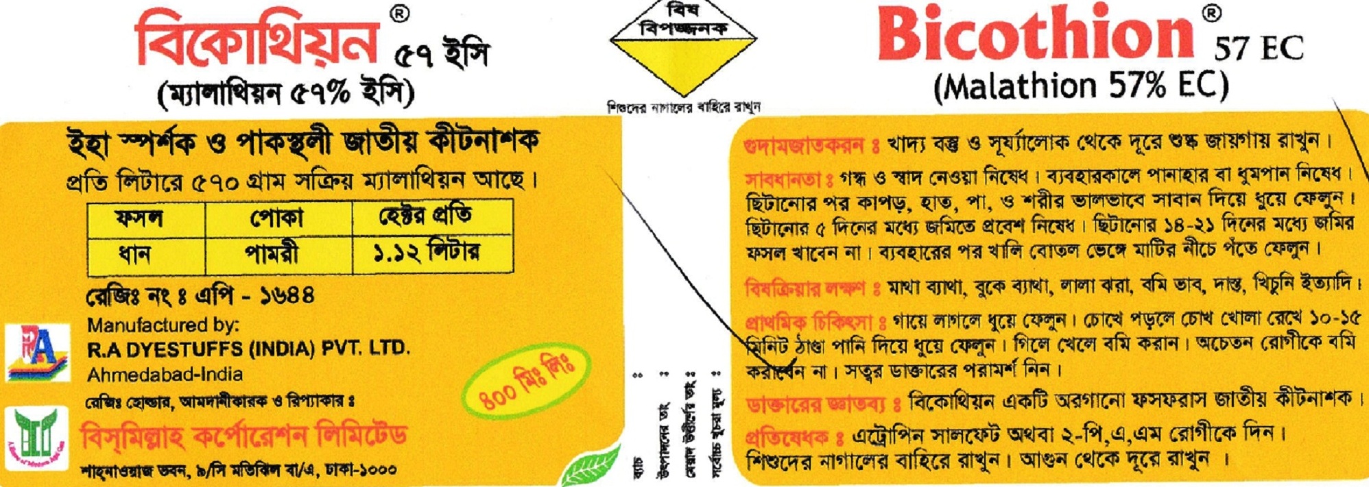 বিকোথিয়ন ৫৭ ইসি স্পর্শক ও পাকস্থলী জাতীয় কীটনাশক।