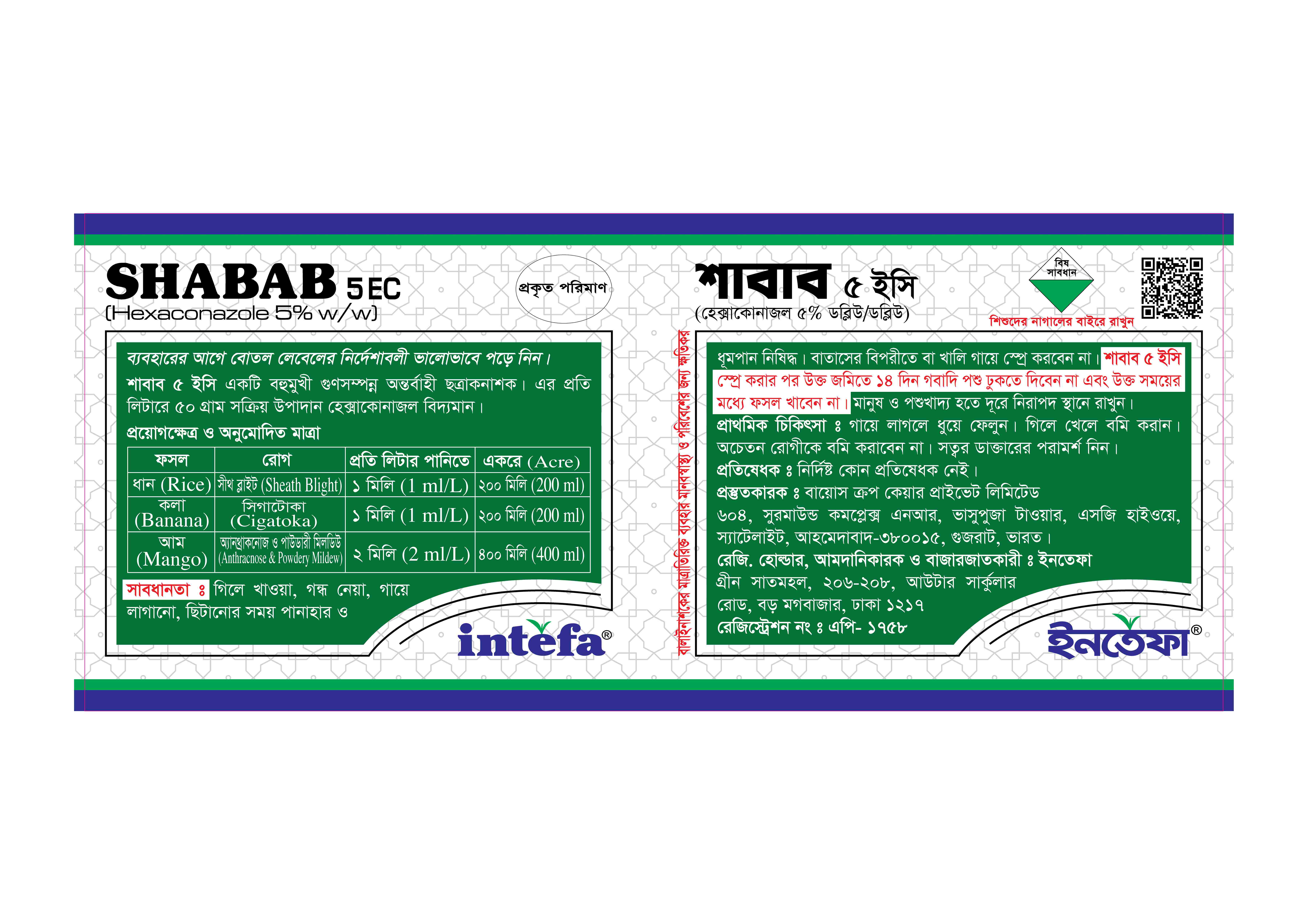 শাবাব ৫ ইসি একটি বহুমুখী গুণসম্পন্ন অন্তর্বাহী ছত্রাকনাশক। এর প্রতি লিটারে ৫০ গ্রাম সক্রিয় উপাদান হেক্সাকোনাজল বিদ্যমান।