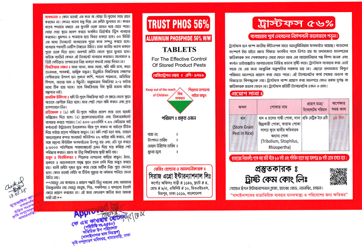 গুদামজাতকৃত মালপত্রের প্রতি মেট্রিক টনে ৪ টি ট্রাস্টফস ট্যাবলেট ব্যবহার করতে হবে।