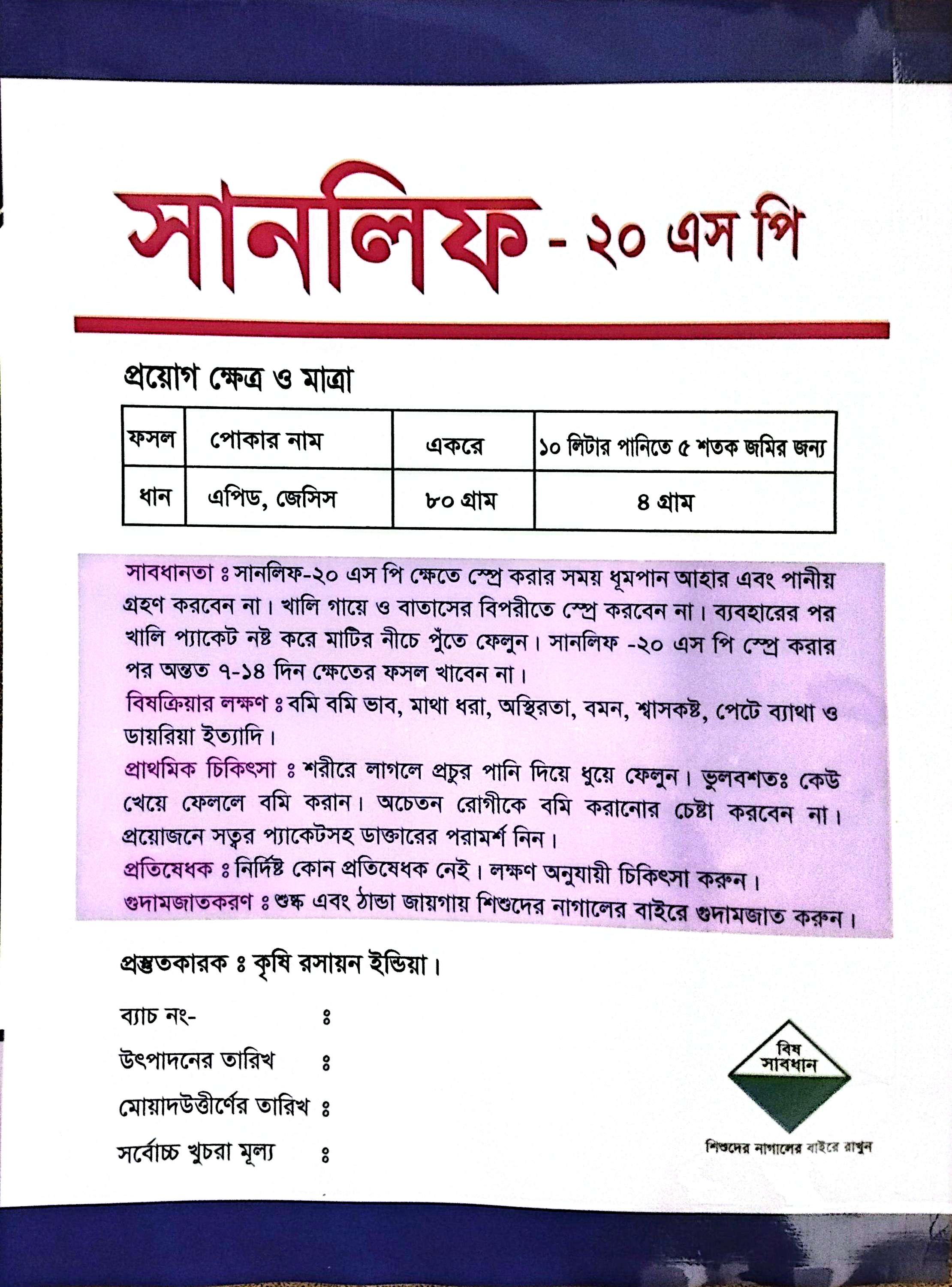 ১০ লিটার পানিতে ০৫ শতক জমির জন্য সানলিফ- ২০ এস পি ৮০ গ্রাম ভাল ভাবে মিশিয়ে স্প্রে করতে হবে।