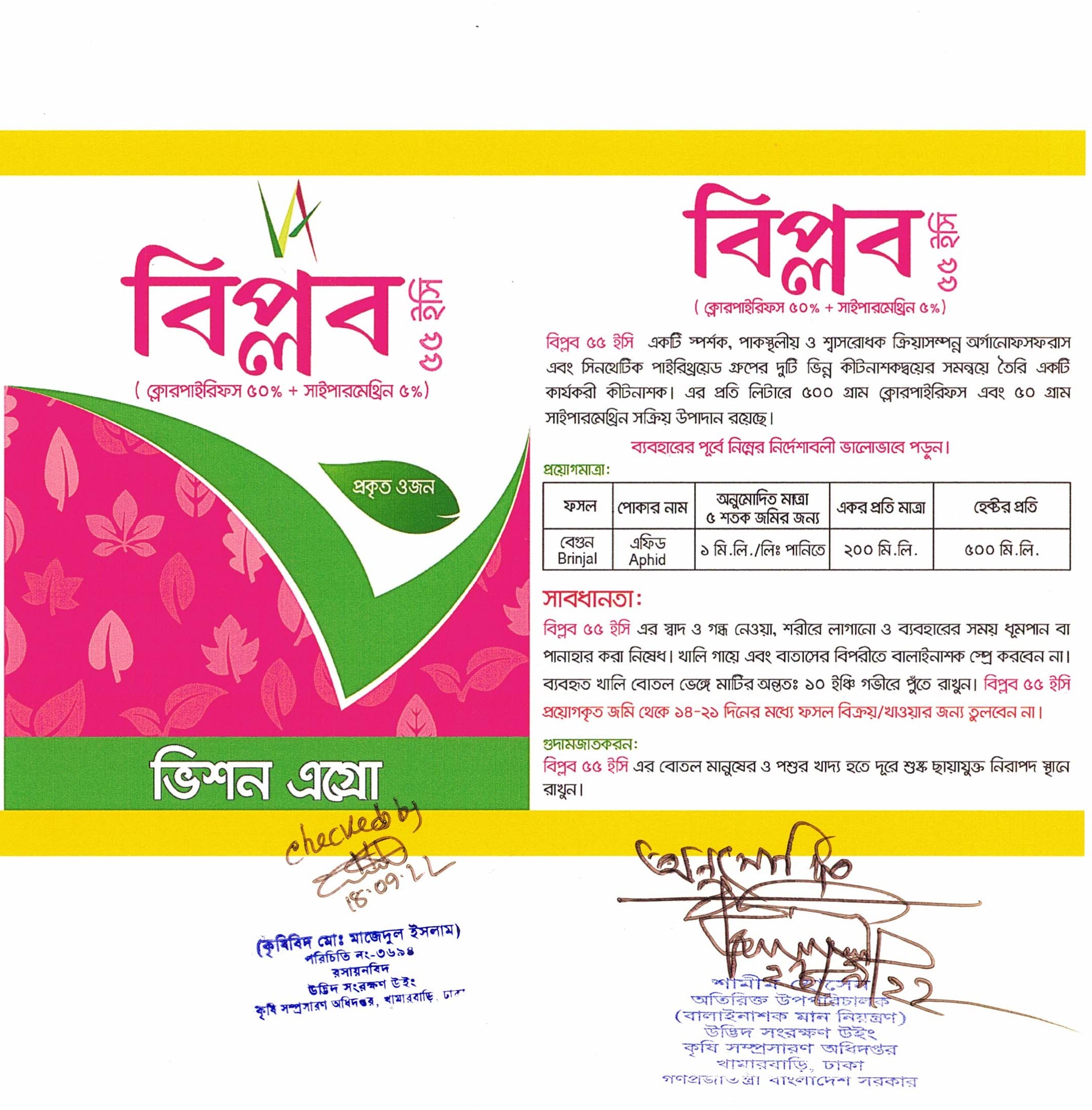 কার্যকরী ফলাফলের জন্য প্রথমে অনুমোদিত মাত্রায় বিপ্লব ৫৫ ইসি প্রতি লিটার পানিতে ১ মিলি মিশিয়ে ভালোভাবে স্প্রে করতে হবে।