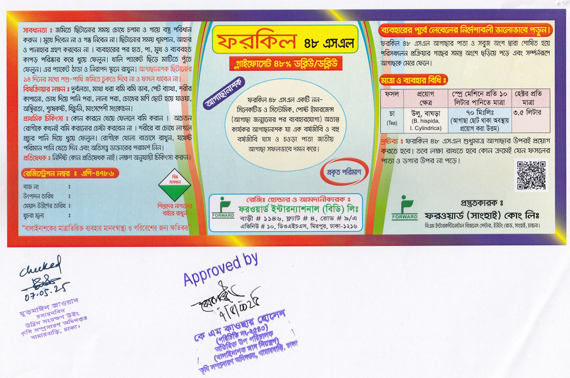 ফরকিল ৪৮ এসএল একটি নন-সিলেকটিভ ও সিস্টেমিক, পোষ্ট ইমারজেন্স (আগাছা জন্মানোর পর ব্যবহারযোগ্য) অত্যন্ত কার্যকর আগাছানাশক যা এক বর্ষজীবি ও বহু বর্ষজীবি ঘাস ও চওড়া পাতা জাতীয় আগাছা সফলভাবে দমন করে। ফরকিল ৪৮ এসএল আগাছার পাতা ও সবুজ অংশ দ্বারা শোষিত হয়ে পরিসঞ্চালন প্রক্রিয়ায় গাছের সমস্থ অংশে ছড়িয়ে পড়ে এবং সম্পূর্ণরুপে আগাছাকে মেরে ফেলে। চায়ের উলু (I. cylindrica) ও বাঘড়া (B. hispida) আগাছা দমনে অত্যন্ত কার্যকরী।