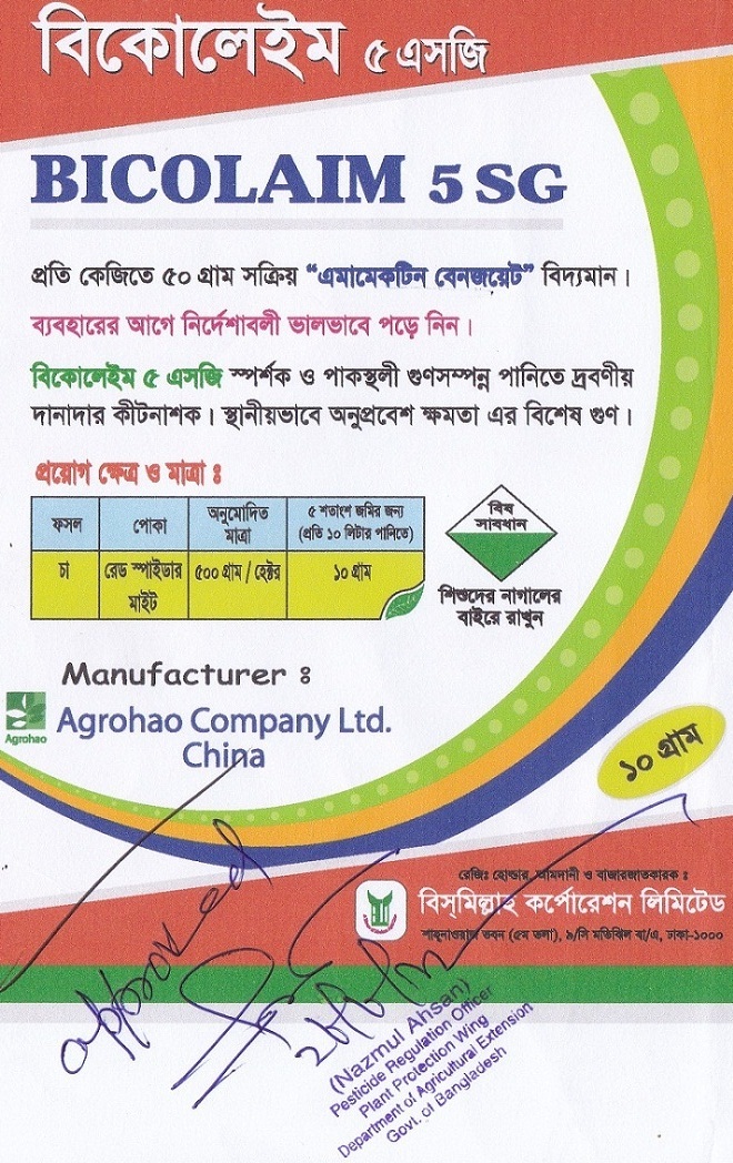 ফসল – চা, পোকা - রেড স্পাইডার মাইট, ১০ গ্রাম (প্রতি ১০ লিটার পানিতে) ৫ শতাংশ জমির জন্য। অনুমোদিত মাত্রাঃ ৫০০ গ্রাম / হেক্টর।