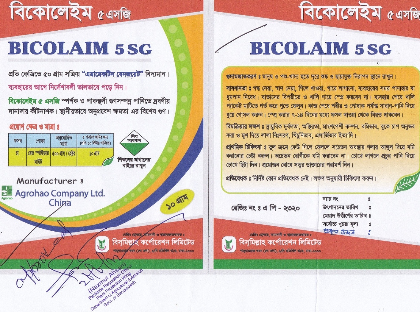 বিকোলেইম ৫ এস জি স্পর্শক ও পাকস্থলী গুণসম্পন্ন পানিতে দ্রবণীয় দানাদার কীটনাশক। স্থানীয়ভাবে অনুপ্রবেশ ক্ষমতা এর বিশেষ গুণ।