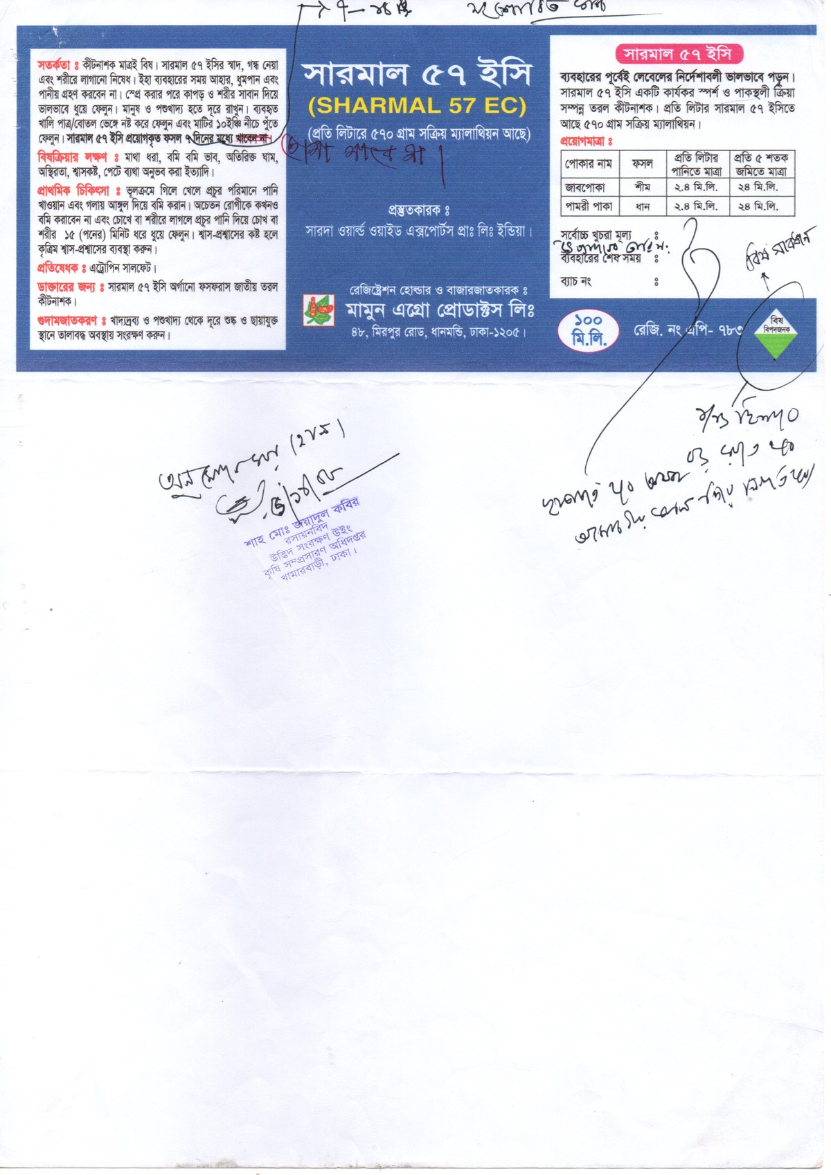 সারমাল ৫৭ ই সি ব্যবহারের ৭-১৪ দিনের মধ্যে গবাদি পশু ও হাঁস, মুরগি ক্ষেতে ঢুকতে দিবেন না এবং ফসল বিক্রয়/খওয়ার জন্য তুবেন না।