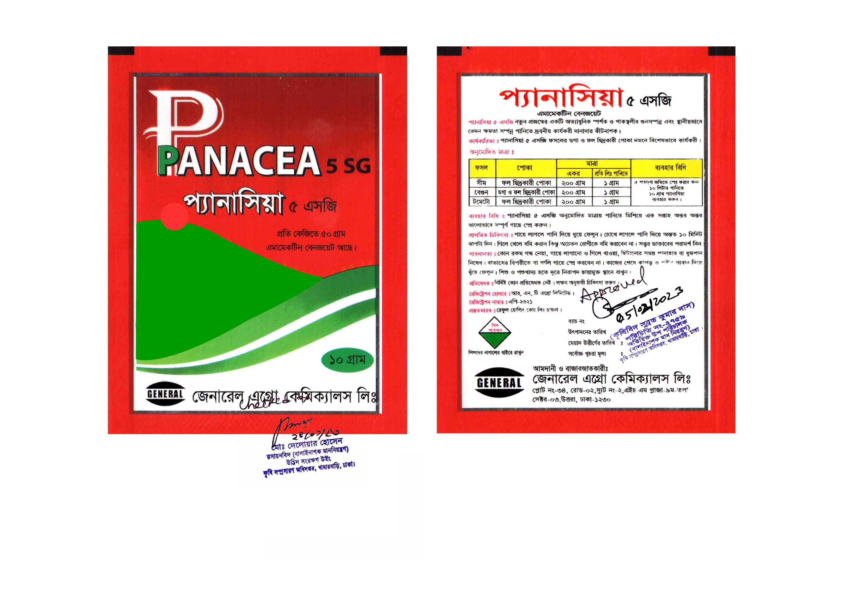 প্যানাসিয়া ৫ এসজি প্যাকেটের উল্লেখিত অনুমোদিত মাত্রায় পানিতে মিশিয়ে এক সপ্তাহ অন্তর অন্তর ভালভাবে সম্পন্ন গাছে স্প্রে করুন।