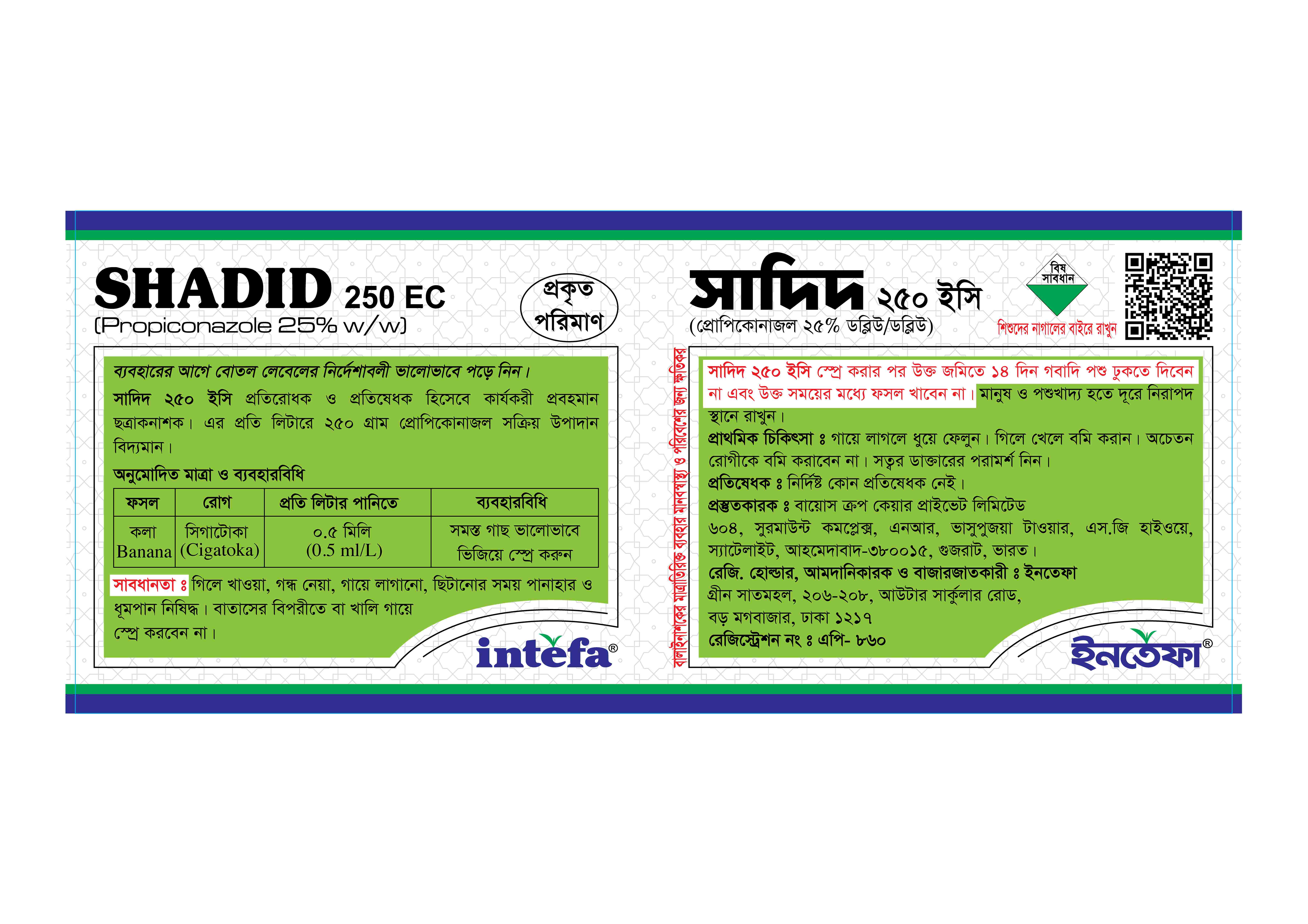 সাদিদ ২৫০ ইসি প্রতিরোধক ও প্রতিষেধক হিসেবে কার্যকরী প্রবহমান ছত্রাকনাশক। এর প্রতি লিটারে ২৫০ গ্রাম প্রোপিকোনাজল সক্রিয় উপাদান বিদ্যমান।