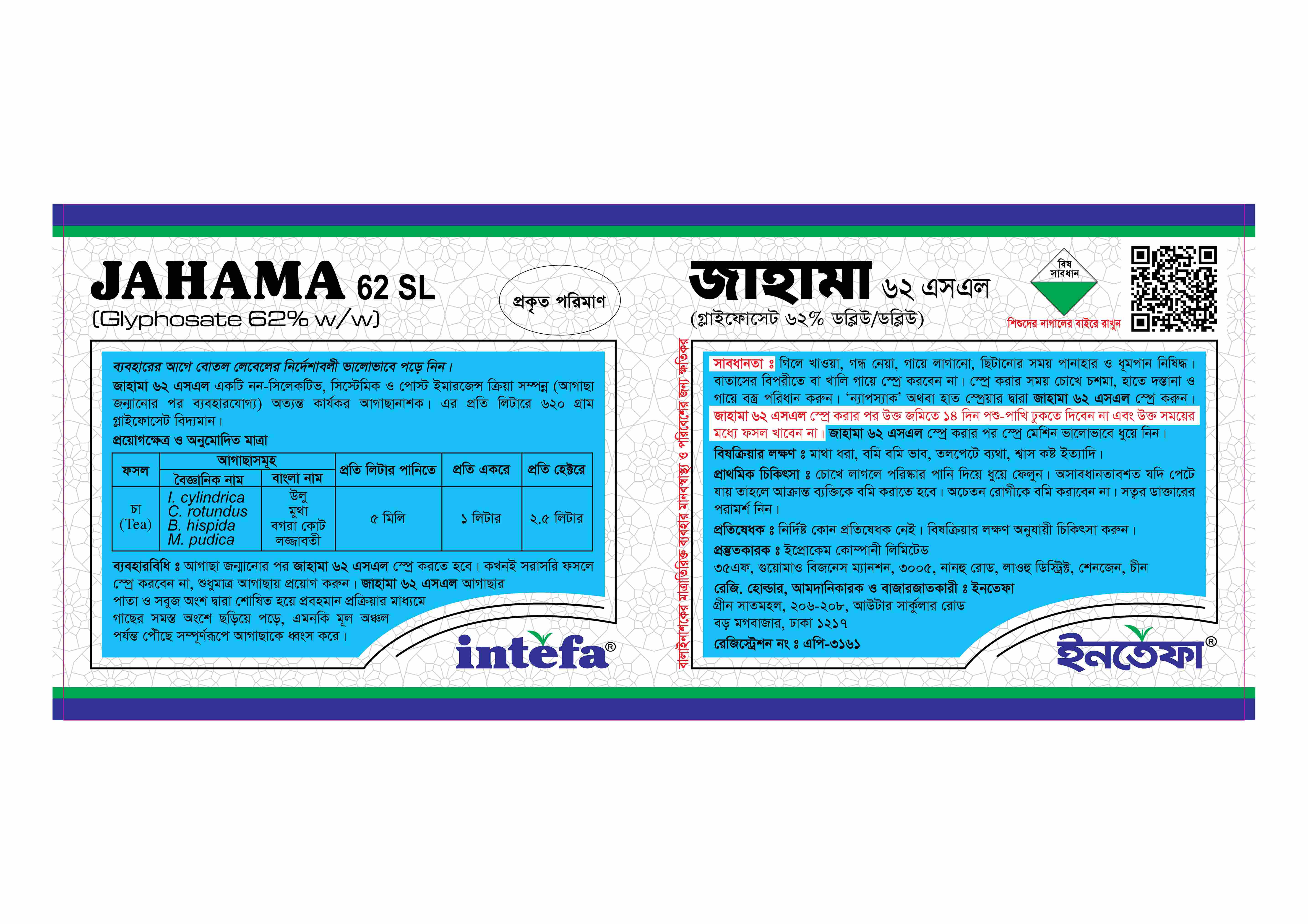 জাহামা ৬২ এসএল একটি নন-সিলেকটিভ, সিস্টেমিক ও পোস্ট ইমারজেন্স ক্রিয়া সম্পন্ন (আগাছা জন্মানোর পর ব্যবহারযোগ্য) অত্যন্ত কার্যকর আগাছানাশক।