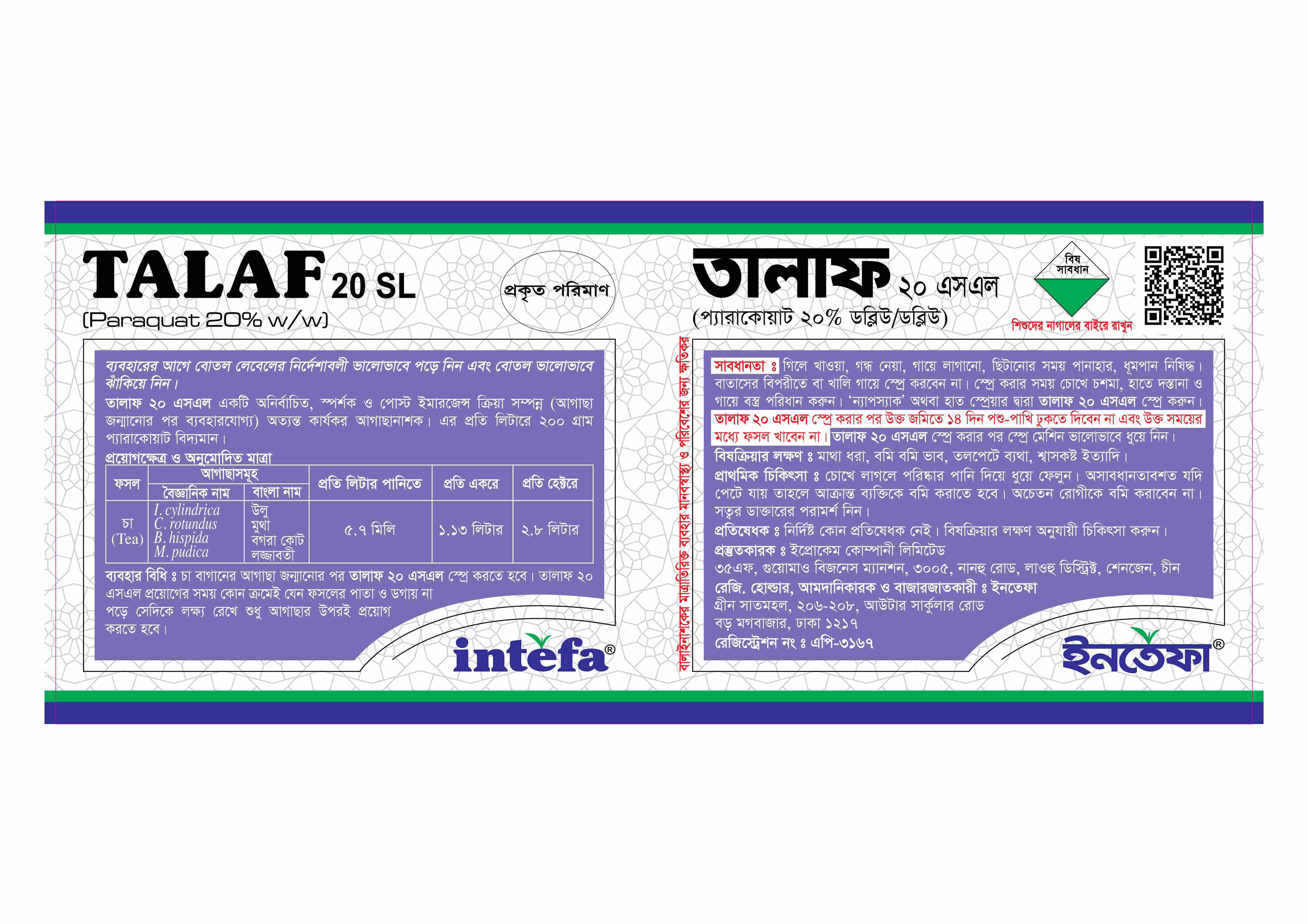 তালাফ ২০ এসএল একটি অনির্বাচিত, স্পর্শক ও পোস্ট ইমারজেন্স ক্রিয়া সম্পন্ন (আগাছা জন্মানোর পর ব্যবহারযোগ্য) অত্যন্ত কার্যকর আগাছানাশক।
