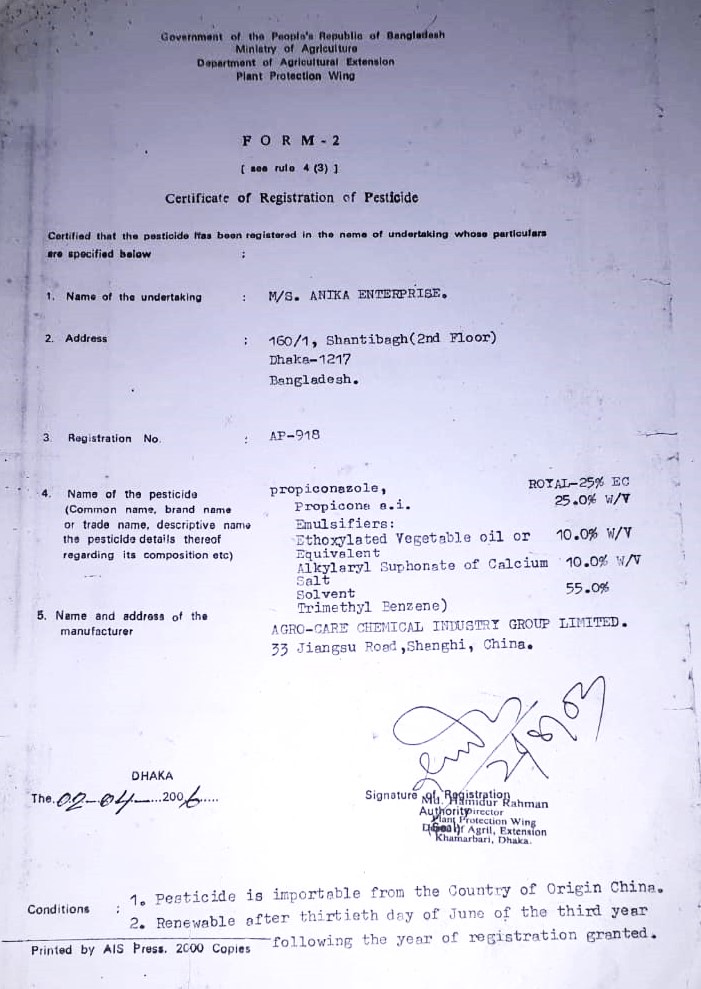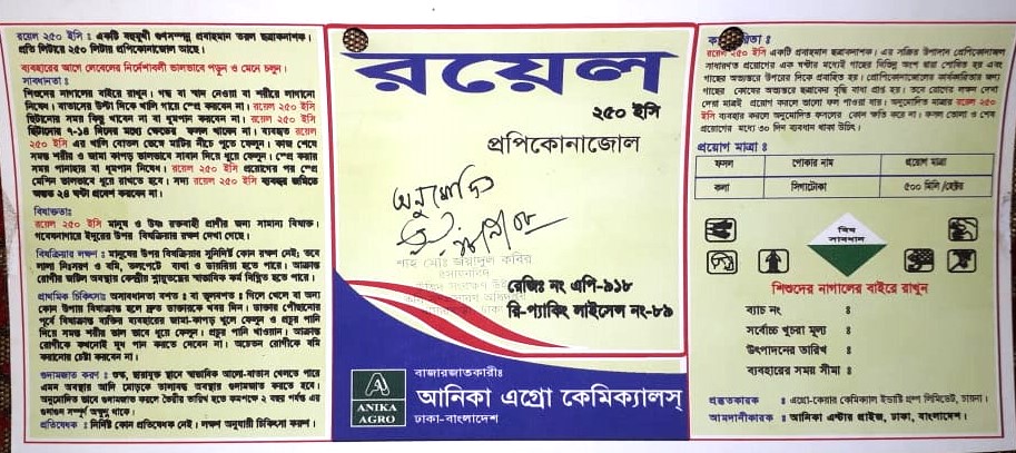 কলার সিকাটোকা রোগর ক্ষেএে প্রয়োগ মাএা = প্রতি লিটার পানিতে ০.৫ মিলি।